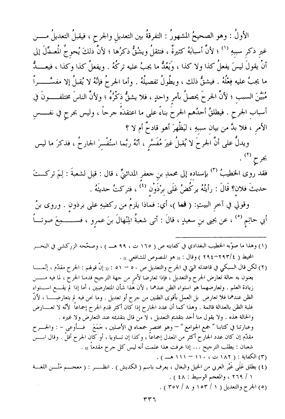 الأولُ: وهو الصحيحُ المشهورُ: التفرقةُ بين التعديلِ والجرحِ، فيقبلُ التعديلُ من غيرِ ذكرِ سببِهِ؛ لأنَّ أسبابَهُ كثيرةٌ، فتثقلُ ويشُقُّ ذكرُها؛ لأنَّ ذلكَ يُحوِجُ المُعدِّلَ إلى أنْ يقولَ ليسَ يفعلُ كذا ولا كذا، وَيَعُدُّ ما يجبُ عليه تركُهُ. ويفعلُ كذا وكذا، فيعدُّ ما يجبُ عليه فِعْلُهُ. فيشقُّ ذلك، ويطُولُ تفصيلُهُ. وأما الجرحُ فإنَّهُ لا يُقبلُ إلا مفسَّراً مُبَيَّنَ السببِ؛ لأنَّ الجرحَ يحصلُ بأمرٍ واحدٍ، فلا يشقُّ ذِكْرُهُ؛ ولأنَّ الناسَ مختلفونَ في أسبابِ الجرحِ. فيطلقُ أحدُهم الجرحَ بناءً على ما اعتقدَهُ جرحاً، وليس بجرحٍ في نفسِ الأمرِ، فلا بدَّ من بيانِ سببِهِ، ليَظْهرَ أهو قادحٌ أم لا؟