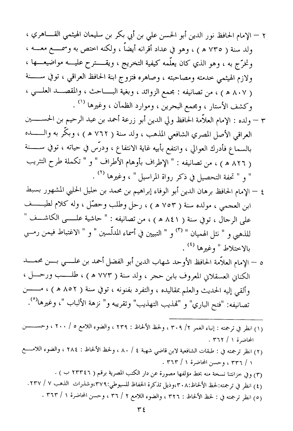 5 - الإمام العلاّمة الحافظ الأوحد شهاب الدين أبو الفضل أحمد بن علي بن محمد الكناني العسقلاني المعروف بابن حجر، ولد سنة (773 هـ) ، طلب ورحل، وألقي إليه الحديث والعلم بمقاليده، والتفرد بفنونه، توفي سنة (852 هـ) ، من تصانيفه: "فتح الباري" و"تهذيب التهذيب" وتقريبه و" نزهة الألباب "، وغيرها.