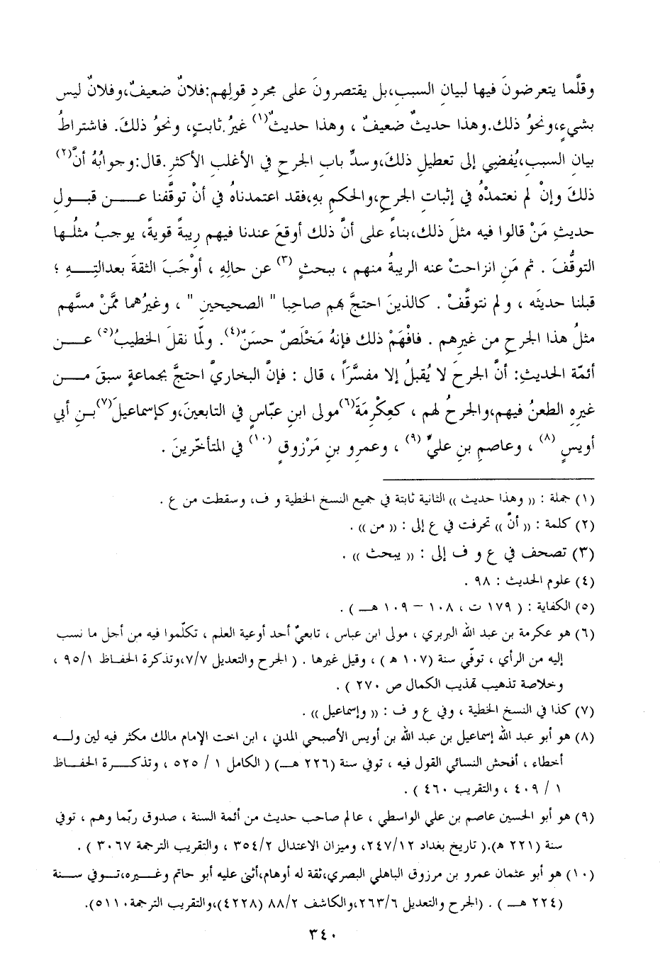 وقلَّما يتعرضونَ فيها لبيانِ السببِ، بل يقتصرونَ على مجردِ قولِهم: فلانٌ ضعيفٌ، وفلانٌ ليس بشيءٍ، ونحوُ ذلك. وهذا حديثٌ ضعيفٌ، وهذا حديثٌ غيرُ ثابتٍ، ونحوُ ذلكَ. فاشتراطُ بيانِ السببِ، يُفضِي إلى تعطيلِ ذلكَ، وسدِّ بابِ الجرحِ في الأغلبِ الأكثرِ. قال: وجوابُهُ أنَّ ذلكَ وإنْ لم نعتمدْهُ في إثباتِ الجرحِ، والحكمِ بهِ، فقد اعتمدناهُ في أنْ توقَّفنا عن قبولِ حديثِ مَنْ قالوا فيه مثلَ ذلك، بناءً على أنَّ ذلك أوقعَ عندنا فيهم رِيبةً قويةً، يوجبُ مثلُها التوقُّفَ. ثم مَنِ انزاحتْ عنه الريبةُ منهم، ببحثٍ عن حالِهِ، أوْجَبَ الثقةَ بعدالتِهِ؛ قبلنا حديثَه، ولم نتوقَّفْ. كالذينَ احتجَّ بهم صاحِبا " الصحيحينِ "، وغيرُهما ممَّنْ مسَّهم مثلُ هذا الجرحِ من غيرِهم. فافْهَمْ ذلك فإنهُ مَخْلَصٌ حسَنٌ. ولمّا نقلَ الخطيبُ عن أئمّة الحديثِ: أنَّ الجرحَ لا يُقبلُ إلا مفسَّرَاً، قال: فإنَّ البخاريَّ احتجَّ بجماعةٍ سبقَ من غيرِهِ الطعنُ فيهم، والجرحُ لهم، كعِكْرِمَةَ مولى ابنِ عبّاسٍ في التابعينَ، وكإسماعيلَبنِ أبي أويسٍ، وعاصمِ بنِ عليٍّ، وعمرِو بنِ مَرْزوقٍ في المتأخّرينَ.