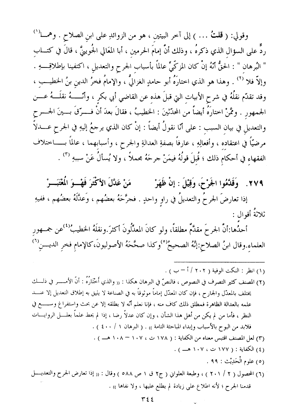 وقولي: (قلتُ ... ) إلى آخر البيتينِ، هو من الزوائدِ على ابنِ الصلاحِ. وهما ردٌّ على السؤالِ الذي ذكرهُ، وذلك أنَّ إمامَ الحرمينِ، أبا المعَالي الجُوينيَّ، قالَ في كتابِ " البُرهانِ ": الحقُّ أنّهُ إنْ كان المزكّيِّ عالماً بأسبابِ الجرحِ والتعديلِ، اكتفينا بإطلاقِهِ. وإلاّ فلا. وهذا هو الذي اختارَهُ أبو حامدٍ الغزاليُّ، والإمامُ فخرُ الدينِ بنُ الخطيبِ، وقد تقدّم نقلُهُ في شرحِ الأبياتِ التي قبلَ هذهِ عن القاضي أبي بكرٍ، وأنّهُ نقلَهُ عن الجمهورِ. وممَّنْ اختارَهُ أيضاً من المحدّثينَ: الخطيبُ، فقالَ بعدَ أنْ فرّقَ بينَ الجرحِ والتعديلِ في بيانِ السببِ: على أنّا نقولُ أيضاً: إنْ كان الذي يرجعُ إليهِ في الجرحِ عدلاً مرضيّاً في اعتقادِهِ، وأفعالِهِ، عارفاً بصفةِ العدالةِ والجرحِ، وأسبابِهما، عالماً باختلافِ الفقهاءِ في أحكامِ ذلك؛ قُبِلَ قولُهُ فيمَنْ جرحَهُ مجملاً، ولا يُسألُ عَنْ سببهِ.