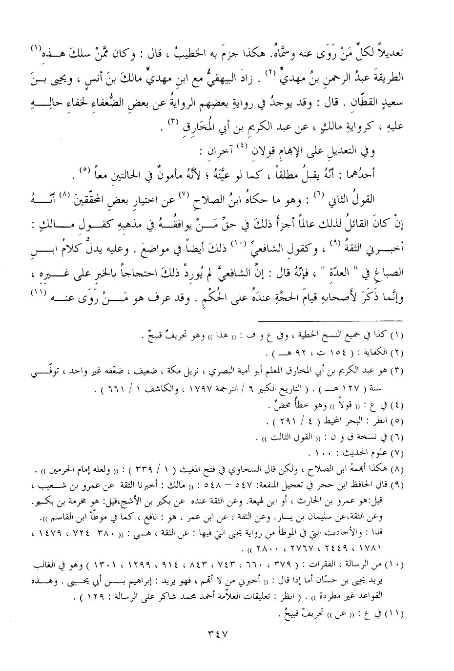 تعديلاً لكلِّ مَنْ رَوَى عنه وسمَّاهُ. هكذا جزمَ به الخطيبُ، قال: وكان ممَّنْ سلكَ هذهِ الطريقةَ عبدُ الرحمنِ بنُ مهديٍّ. زادَ البيهقيُّ مع ابنِ مهديٍّ مالكَ بنَ أنسٍ، ويحيى بنَ سعيدٍ القطّانِ. قال: وقد يوجدُ في روايةِ بعضِهم الروايةُ عن بعضِ الضُّعفاءِ لخفاءِ حالِهِ عليهِ، كروايةِ مالكٍ، عن عبد الكريمِ بن أبي المُخَارِقِ.
