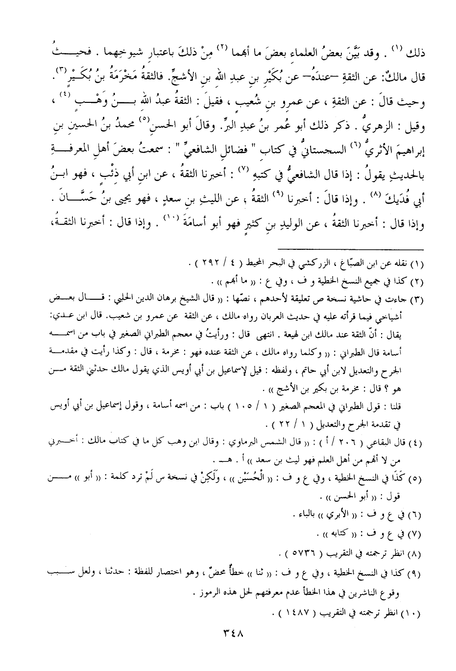 ذلك. وقد بَيَّنَ بعضُ العلماءِ بعضَ ما أبهما مِنْ ذلكَ باعتبارِ شيوخِهما. فحيثُ قال مالكٌ: عن الثقةِ -عندَهُ- عن بُكَيْرِ بنِ عبدِ اللهِ بنِ الأشجِّ. فالثقةُ مَخْرَمَةُ بنُ بُكَيْرٍ. وحيث قالَ: عن الثقةِ، عن عمرِو بنِ شُعيبٍ، فقيلَ: الثقةُ عبدُ اللهِ بنُ وَهْبٍ، وقيل: الزهريُّ. ذكر ذلك أبو عُمر بنُ عبدِ البرِّ. وقالَ أبو الحسنِ محمدُ بنُ الحسينِ بنِ إبراهيمَ الأثريُّ السجستانيُّ في كتابِ " فضائلِ الشافعيِّ ": سمعتُ بعضَ أهلِ المعرفةِ بالحديثِ يقولُ: إذا قال الشافعيُّ في كتبهِ: أخبرنا الثقةُ، عن ابنِ أبي ذِئْبٍ، فهو ابنُ أبي فُدَيكَ. وإذا قالَ: أخبرنا الثقةُ، عن الليثِ بنِ سعدٍ، فهو يحيى بنُ حَسَّانَ. وإذا قال: أخبرنا الثقةُ، عن الوليدِ بنِ كثيرٍ فهو أبو أسامَةَ. وإذا قال: أخبرنا الثقةُ،