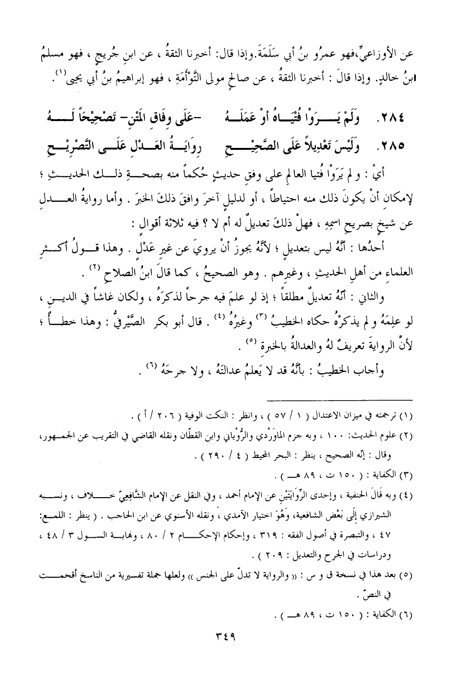 284.... وَلَمْ يَرَوْا فُتْيَاهُ أوْ عَمَلَهُ ... عَلَى وِفَاقِ المَتْنِ تَصْحِيْحَاً لَهُ