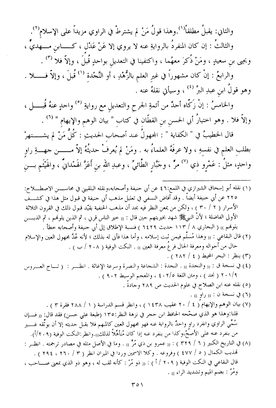 قال الخطيبُ في " الكفاية ": المجهولُ عند أصحابِ الحديثِ: كُلُّ مَنْ لم يشتهرْ بطلبِ العلمِ في نفسِهِ، ولا عرفَهُ العلماءُ به. ومَنْ لم يُعرفْ حديثُهُ إلاّ من جهةِ راوٍ واحدٍ، مثلُ: عَمْرٍو ذِي مرٍّ، وجَبَّارٍ الطَّائيِّ، وعبدِ اللهِ بنِ أَعَزَّ الهَمْدانيِّ، والهَيْثَمِ بنِ