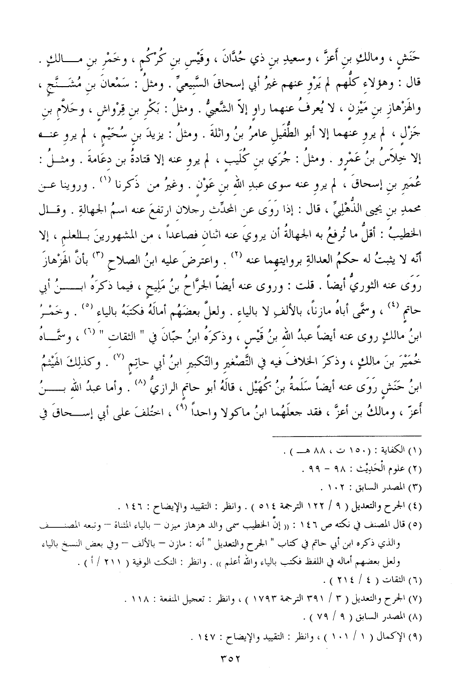 حَنَشٍ، ومالكِ بنِ أَعزَّ، وسعيدِ بنِ ذي حُدَّانَ، وقَيْسِ بنِ كُرْكُمٍ، وخَمْرِ بنِ مالكٍ. قال: وهؤلاءِ كلُّهم لم يَرْوِ عنهم غيرُ أبي إسحاقَ السَّبِيعيِّ. ومثلُ: سَمْعانَ بنِ مُشَنَّجٍ، والهَزْهازِ بنِ مَيْزنٍ، لا يُعرفُ عنهما راوٍ إلاّ الشَّعبيُّ. ومثلُ: بَكْرِ بنِ قِرْواشٍ، وحَلاَّمِ بنِ جَزْلٍ، لم يروِ عنهما إلا أبو الطُّفَيلِ عامرُ بنُ واثلةَ. ومثلُ: يزيدَ بنِ سُحَيْمٍ، لم يروِ عنه إلا خِلاَسُ بنُ عَمْرٍو. ومثلُ: جُرَي بنِ كُلَيبٍ، لم يروِ عنه إلا قتادةُ بن دِعَامةَ. ومثلُ: عُمَيرِ بنِ إسحاقَ، لم يروِ عنه سوى عبدِ اللهِ بنِ عَوْنٍ. وغيرُ من ذَكرنا. وروينا عن محمدِ بنِ يحيى الذُّهْلِيِّ، قال: إذا رَوَى عن المحدِّثِ رجلانِ ارتفعَ عنه اسمُ الجهالةِ. وقال الخطيبُ: أقلُّ ما تُرفعُ به الجهالةُ أن يرويَ عنه اثنانِ فصاعداً، من المشهورينَ بالعلمِ، إلا أنّه لا يثبتُ له حكمُ العدالةِ بروايتهِما عنه. واعترضَ عليه ابنُ الصلاحِ بأنَّ الهَزْهازَ رَوَى عنه الثوريُّ أيضاً. قلت: وروى عنه أيضاً الجرَّاحُ بنُ مَلِيحٍ، فيما ذكرَهُ ابنُ أبي حاتمٍ، وسمَّى أباهُ مازناً، بالألفِ لا بالياءِ. ولعلَّ بعضَهُم أمالَهُ فكتبَهُ بالياءِ. وخَمْرُ ابنُ مالكٍ روى عنه أيضاً عبدُ اللهِ بنُ قَيْسٍ، وذكرَهُ ابنُ حبّانَ في " الثقاتِ "، وسمَّاهُ خُمَيْرَ بنَ مالكٍ، وذكرَ الخلافَ فيه في التَّصْغيرِ والتّكبيرِ ابنُ أبي حاتِمٍ.