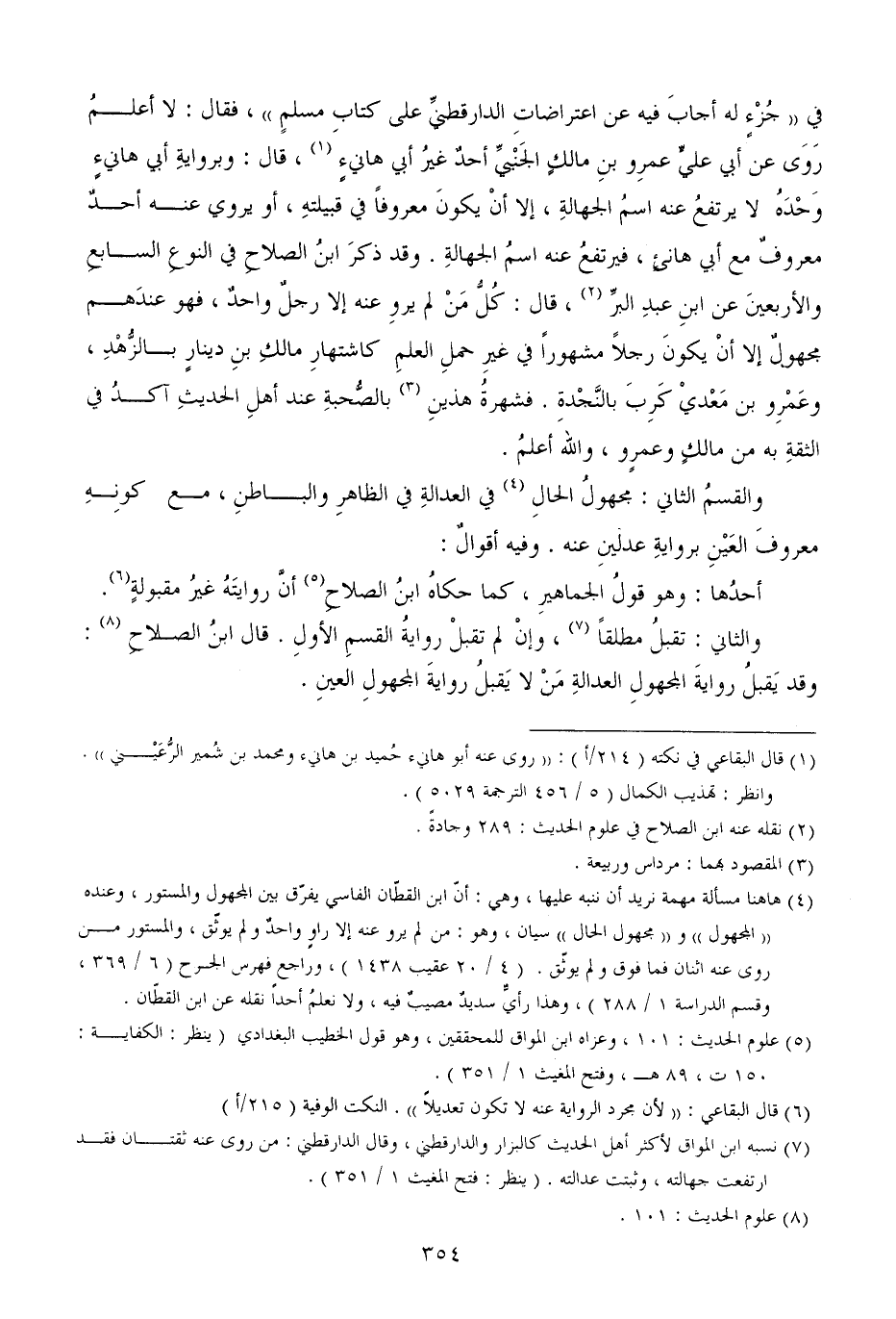 في ((جُزْءٍ له أجابَ فيه عن اعتراضاتِ الدارقطنيِّ على كتابِ مسلمٍ)) ، فقال: لا أعلمُ رَوَى عن أبي عليٍّ عمرِو بنِ مالكٍ الجَنْبيِّ أحدٌ غيرُ أبي هانيءٍ، قال: وبروايةِ أبي هانيءٍ وَحْدَهُ لا يرتفعُ عنه اسمُ الجهالةِ، إلا أنْ يكونَ معروفاً في قبيلتهِ، أو يروي عنه أحدٌ معروفٌ مع أبي هانئٍ، فيرتفعُ عنه اسمُ الجهالةِ. وقد ذكرَ ابنُ الصلاحِ في النوعِ السابعِ والأربعينَ عن ابنِ عبدِ البرِّ، قال: كُلُّ مَنْ لم يروِ عنه إلا رجلٌ واحدٌ، فهو عندَهم مجهولٌ إلا أنْ يكونَ رجلاً مشهوراً في غيرِ حملِ العلمِ كاشتهارِ مالكِ بنِ دينارٍ بالزُّهْدِ، وعَمْرِو بن مَعْديْ كَرِبَ بالنَّجْدةِ. فشهرةُ هذينِ بالصُّحبةِ عند أهلِ الحديثِ آكدُ في الثقةِ به من مالكٍ وعمرٍو، والله أعلمُ.