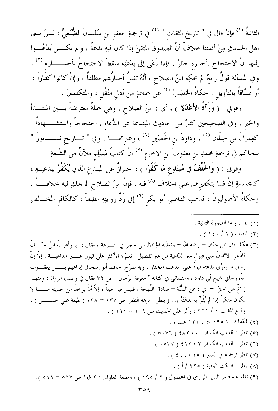 الثانيةُ فإنهُ قال في " تاريخ الثقاتِ " في ترجمةِ جعفرِ بنِ سُليمانَ الضُّبَعيِّ: ليسَ بين أهلِ الحديثِ مِنْ أئمتنا خلافٌ أنَّ الصدوقَ المتقنَ إذا كان فيهِ بدعةٌ، ولم يكن يَدْعُوا إليها أنَّ الاحتجاجَ بأخبارِهِ جائزٌ. فإذا دَعَى إلى بِدْعَتِهِ سقطَ الاحتجاجُ بأخبارِهِ. وفي المسألةِ قولٌ رابعٌ لم يحكِه ابنُ الصلاحِ، أنَّهُ تقبلُ أخبارُهم مطلقاً، وإنْ كانوا كفّاراً، أو فُسَّاقاً بالتأويلِ. حكاهُ الخطيبُ عن جماعةٍ من أهلِ النَّقْلِ، والمتكلمينَ.