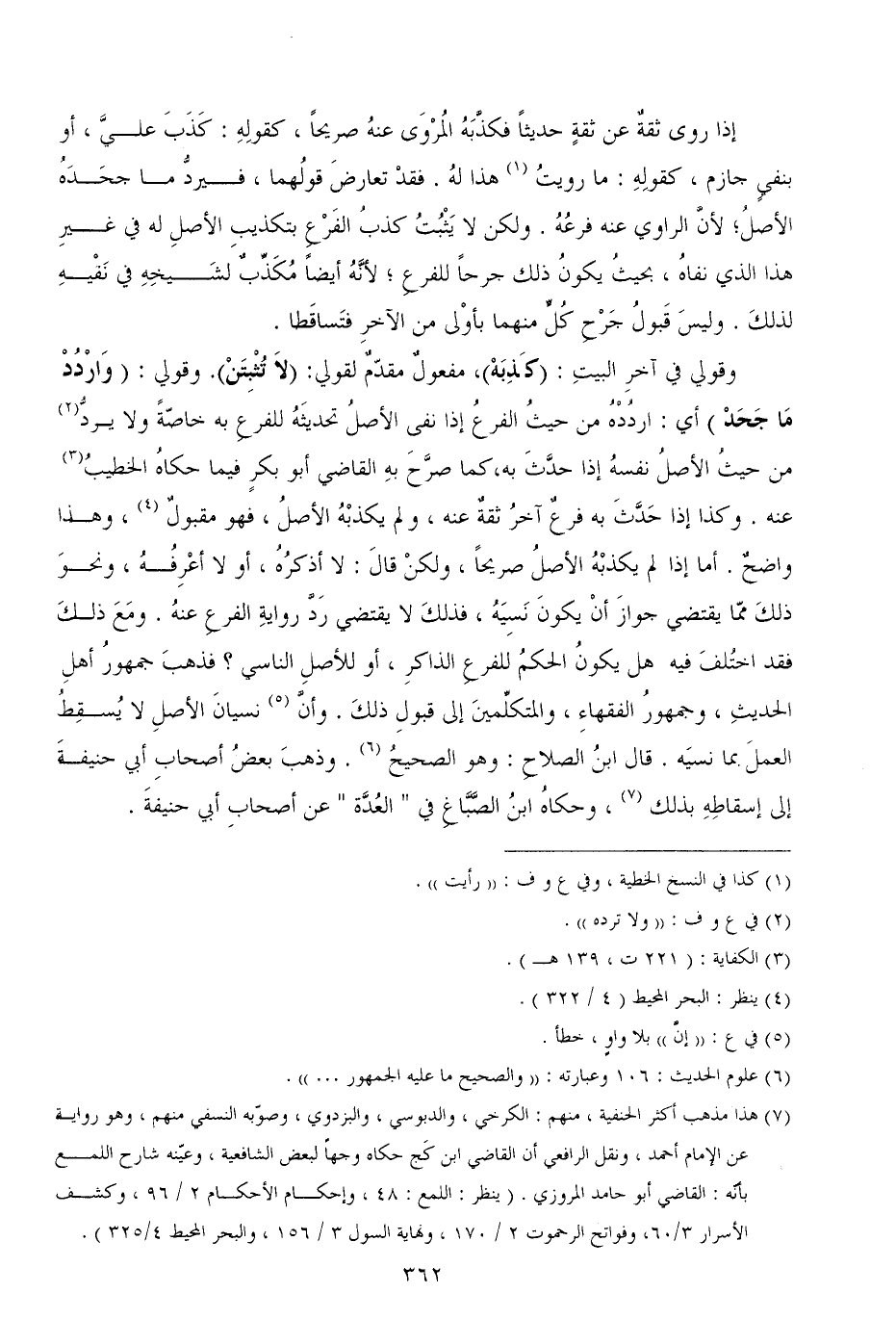 وقولي في آخرِ البيتِ كَذِبَهْ، مفعولٌ مقدّمٌ لقولي لاَ تُثْبِتَنْ وقولي وَارْدُدْ مَا جَحَدْ أي اردُدْهُ من حيثُ الفرعُ إذا نفى الأصلُ تحديثَهُ للفرعِ به خاصّةً ولا يردُّ من حيثُ الأصلُ نفسهُ إذا حدَّثَ به، كما صرَّحَ بهِ القاضي أبو بكرٍ فيما حكاهُ الخطيبُ عنه وكذا إذا حَدَّثَ به فرعٌ آخرُ ثقةٌ عنه، ولم يكذبْهُ الأصلُ، فهو مقبولٌ، وهذا واضحٌ أما إذا لم يكذبْهُ الأصلُ صريحاً، ولكنْ قالَ لا أذكرُهُ، أو لا أعْرِفُهُ، ونحوَ ذلكَ ممّا يقتضي جوازَ أنْ يكونَ نَسِيَهُ، فذلكَ لا يقتضي رَدَّ روايةِ الفرعِ عنهُ ومَعَ ذلكَ فقد اختُلفَ فيه هل يكونُ الحكمُ للفرعِ الذاكرِ، أو للأصلِ الناسي؟ فذهبَ جمهورُ أهلِ الحديثِ، وجمهورُ الفقهاءِ، والمتكلِّمينَ إلى قبولِ ذلكَ وأنَّ نسيانَ الأصلِ لا يُسقِطُ العملَ بما نسيَه قال ابنُ الصلاحِ وهو الصحيحُ وذهبَ بعضُ أصحابِ أبي حنيفةَ إلى إسقاطِهِ بذلك، وحكاهُ ابنُ الصَّبَّاغِ في العُدَّة عن أصحابِ أبي حنيفةَ