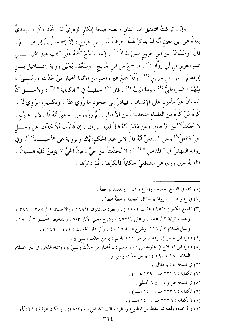 وإنّما تركتُ التمثيلَ بهذا المثالِ؛ لعدم صحةِ إنكارِ الزهريِّ لَهُ فَقَدْ ذَكَرَ الترمذيُّ بعدَهُ عن ابنِ مَعِينٍ أنَّهُ لَمْ يذكرْ هَذَا الحرفَ عَلَى ابنِ جريجٍ، إلاّ إسماعيلُ بنُ إبراهيمَ قَالَ وسَمَاعُهُ عن ابنِ جريجٍ ليسَ بذاكَ إنّما صَحَّحَ كُتُبَهُ عَلَى كتبِ عبدِ المجيدِ بنِ عبدِ العزيزِ بنِ أبي رَوَّادٍ، ما سمعَ من ابنِ جُريجٍ وضَعَّفَ يَحْيَى روايةَ إسماعيلَ بنِ إبراهيمَ، عن ابنِ جريجٍ وَقَدْ جمعَ غيرُ واحدٍ من الأئمةِ أخبارَ مَنْ حَدَّثَ، ونَسِيَ، مِنْهُمْ الدارقطنيُّ، والخطيبُ، قالَ الخطيبُ في الكفايةِ ولأجلِ أنَّ النسيانَ غيرُ مأمونٍ عَلَى الإنسانِ، فيبادرُ إِلَى جحودِ ما رُوي عَنْهُ، وتكذيبِ الرَّاوِي لَهُ، كَرِهَ مَنْ كَرِهَ من العلماءِ التحديثَ عن الأحياءِ ثُمَّ رَوَى عن الشعبيِّ أنّهُ قَالَ لابنِ عَوْنٍ لا تحدّثْعن الأحياءِ وعن مَعْمَرٍ أنّهُ قالَ لعبدِ الرزاقِ إنْ قَدَرْتَ ألاّ تحدِّثَ عن رجلٍ حيٍّ فافعلْ وعن الشافعيِّ أنَّهُ قَالَ لابنِ عبدِ الحكم إيَّاكَ والروايةَ عن الأحياءِ وفي روايةِ البيهقيِّ في المدخلِ لا تُحدِّثْ عن حيٍّ، فإنَّ الحيَّ لا يؤمَنُ عَلَيْهِ النسيانُ، قالَه لهُ حينَ رَوَى عنِ الشافعيِّ حكايةً فأنكرَها، ثُمَّ ذكرَها