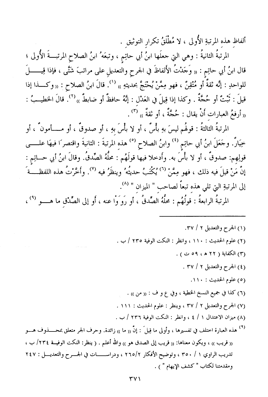 المرتبةُ الثانيةُ: وهي التي جعلَها ابنُ أبي حاتِمٍ، وتبعَهُ ابنُ الصلاحِ المرتبةَ الأُولى؛ قال ابنُ أبي حاتِمٍ: ((وَجَدْتُ الأَلفاظَ في الجرحِ والتعديلِ على مراتبَ شَتَّى، فإذا قِيلَ للواحدِ: إنَّه ثقةٌ أو مُتْقِنٌ، فهو مِمَّنْ يُحْتَجَّ بحديثهِ)) . قالَ ابنُ الصلاحِ: ((وكذا إذا قيلَ: ثَبْتٌ أو حُجَّةٌ. وكذا إذا قِيلَ في العَدْلِ: إنَّهُ حافظٌ أو ضابطٌ)) . قالَ الخطيبُ: ((أرفعُ العباراتِ أَنْ يقال: حُجَّةٌ، أو ثقةٌ)) .