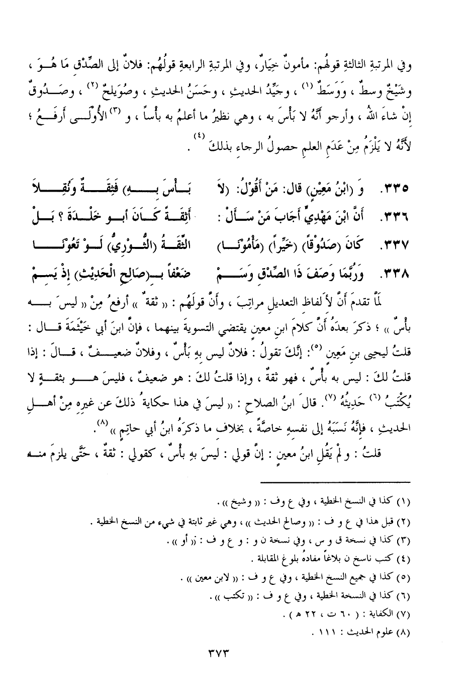 لمَاَّ تقدمَ أَنَّ لأَِلفاظِ التعديلِ مراتِبَ، وأَنَّ قولَهُم: ((ثقةٌ)) أرفعُ مِنْ ((ليسَ به بأْسٌ)) ؛ ذكرَ بعدَهُ أَنَّ كلامَ ابنِ معينٍ يقتضي التسويةَ بينهما، فإنَّ ابنَ أبي خَيْثَمَةَ قال: قلتُ ليحيى بنِ مَعِينٍ: إنَّكَ تقولُ: فلانٌ ليس بِهِ بَأْسٌ، وفلانٌ ضعيفٌ، قالَ: إذا قلتُ لكَ: ليس به بأْسٌ، فهو ثقةٌ، وإذا قلتُ لكَ: هو ضعيفٌ، فليسَ هو بثقةٍ لا يُكْتَبُ حَدِيثُهُ. قالَ ابنُ الصلاحِ: ((ليسَ في هذا حكايةُ ذلكَ عن غيرِهِ مِنْ أهلِ الحديثِ، فإِنَّهُ نَسَبَهُ إلى نفسِهِ خاصَّةً، بخلافِ ما ذكرَهُ ابنُ أبي حاتِمٍ)) .