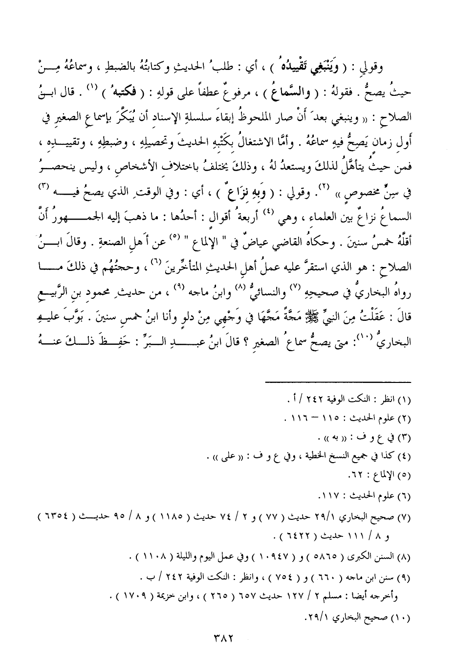 وقوليِ: (وَيَنْبَغِي تَقْييدُهُ) ، أي: طلبُ الحديثِ وكتابتُهُ بالضبطِ، وسماعُهُ مِنْ حيثُ يصحُّ. فقولهُ: (والسَّماعُ) ، مرفوعٌ عطفاً على قولهِ: (فكتبهُ) . قال ابنُ الصلاحِ: ((وينبغي بعدَ أَنْ صار الملحوظُ إبقاءَ سلسلةِ الإسنادِ أن يُبَكَّرَ بإسماعِ الصغيرِ في أَولِ زمانٍ يَصِحُّ فيهِ سماعُهُ. وأمَّا الاشتغالُ بِكَتْبِهِ الحديثَ وتحصيلِهِ، وضبطِهِ، وتقييدِهِ، فمن حيثُ يتأهَّلُ لذلكَ ويستعدُ لهُ، وذلكَ يختلفُ باختلافِ الأشخاصِ، وليس ينحصرُ في سِنٍّ مخصوصٍ)) . وقولي: (وَبِهِ نِزَاعٌ) ، أي: وفي الوقتِ الذي يصحُ فيه السماعُ نزاعٌ بين العلماءِ، وهي أربعةُ أقوالٍ: أحدُها: ما ذهبَ إليه الجمهورُ أَنَّ أقلَّهُ خمسُ سنينَ. وحكاهُ القاضي عياضٌ في " الإلماع " عن أَهلِ الصنعةِ. وقالَ ابنُ الصلاحِ: هو الذي استقرَّ عليه عملُ أهلِ الحديثِ المتأخِّرينَ، وحجتُهُم في ذلكَ ما رواهُ البخاريُّ في صحيحِهِ والنسائيُّ وابنُ ماجه، من حديثِ محمودِ بنِ الرَّبيعِ قالَ: عَقَلْتُ مِنَ النبيِّ (مَجَّةً مَجَّهَا في وَجْهِي مِنْ دلوٍ وأنا ابنُ خمسِ سنينَ. بَوَّبَ عليهِ البخاريُّ: متى يصحُّ سماعُ الصغيرِ؟ قالَ ابنُ عبدِ البَرِّ: حَفِظَ ذلكَ عنهُ
