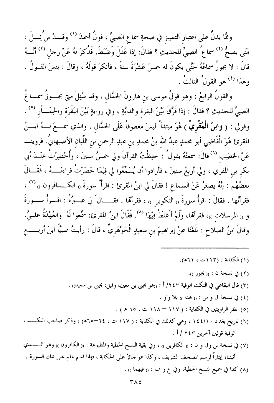 والقولُ الرابعُ: وهو قولُ موسى بنِ هارونَ الحمَّالِ، وقد سُئِلَ متى يجوزُ سماعُ الصبيِّ للحديثِ؟ فقالَ: إذا فَرَّقَ بَيْنَ البقرةِ والدابَّةِ، وفي روايةٍ بَيْنَ البَقَرَةِ والحِمَاْرِ. وقولي: (وابنُ الْمُقْرِيْ) هُوَ مبتدأٌ ليسَ معطوفاً عَلَى الحمَّالِ. والذي سمعَ لهُ ابنُ المقرئ هُوَ الْقَاضِي أبو محمدٍ عبدُ اللهِ بنُ محمدِ بنِ عبدِ الرحمنِ بنِ اللَّبانِ الأصبهانيُّ. فروينا عَنْ الخطيبِ قالَ: سمعتُهُ يقولُ: حفِظْتُ القرآنَ ولي خمسُ سنينَ، وأُحْضِرْتُ عِنْدَ أبي بكرِ بنِ المقري، ولي أربعُ سنينَ، فأرادوا أن يُسَمِّعُوا لي فِيْمَا حَضَرْتُ قراءتَهُ، فَقَالَ بعضُهُم: إنَّهُ يصغرُ عَنْ السماعِ! فقالَ لي ابنُ المقرئ: اقرأْْ سورةَ ((الكافرون)) ، فقرأتُها. فقالَ: اقرأْ سورةَ ((التكويرِ)) ، فقرأتها. فقالَ لي غيرُهُ: اقرأْ سورةَ و ((المرسلاتِ)) ، فقرأتها، وَلَمْ أَغلطْ فِيْهَا. فَقَالَ ابنُ المقرئ: سمِّعوا لَهُ والعُهْدَةُ عليَّ. وقالَ ابنُ الصلاحِ: بَلَغَنَا عنْ إبراهيمَ بنِ سعيدٍ الْجَوْهَرِيِّ، قالَ: رأيتُ صبيَّاً ابنَ أربعِ