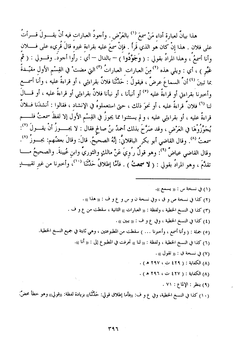 هذا بيانٌ لعبارةِ أداءِ مَنْ سمعَ بالعَرْضِ. وأجودُ العباراتِ فيه أنْ يقولَ قرأتُ على فلانٍ. هذا إِنْ كان هو الذي قَرأَ. فإِنْ سمعَ عليه بقراءةِ غيرهِ قالَ قُرِيء على فلانٍ وأنا أسمعُ، وهذا المرادُ بقولي: (وَجَوَّدُوا) - بالدال - أي: رأوا أجودَ. وقولي: (ثم عَبِّرِ) ، أي: ويلي هذه مِنَ العباراتِ العباراتُ التي مضتْ في القِسْمِ الأولِ مقيّدةً بما تبينَ أنَّ السماعَ عرضٌ، فيقولُ: حَدَّثَنَا فلانٌ بقراءتِي، أو قراءةً عليه، وأنا أسمع وأخبرنا بقراءتي أو قراءةً عليه أو أنبأنا، أو نبأنا فلانٌ بقراءتِي أو قراءةً عليه، أو قالَ لنا فلانٌ قراءةً عليه، أو نحوَ ذلك، حتى استعملوهُ في الإنشادِ، فقالوا: أنشدَنا فلانٌ قراءةً عليه، أو بقراءتِي عليه، ولم يستثنوا مما يجوزُ في القِسْمِ الأول إلا لفظَ سمعتُ فلم يُجَوِّزُوْهَا في العَرْضِ، وقد صَرَّحَ بذلك أحمدُ بنُ صالحٍ فقال: لا يجوزُ أنْ يقولَ: سمعتُ. وقال القاضي أبو بكرٍ الباقلانيُّ: إنَّهُ الصحيحُ. قالَ: وقالَ بعضُهم: يجوزُ. وقال القاضي عياضٌ: وهو قولٌ رُوِيَ عَنْ مالكٍ والثوريِّ وابنِ عُيينةَ. والصحيحُ ما تقدَّمَ، وهو المرادُ بقولي: (لا سمعتُ) . فأمَّا إطلاقُ حَدَّثَنَا، وأخبرنا من غيرِ تقييدٍ