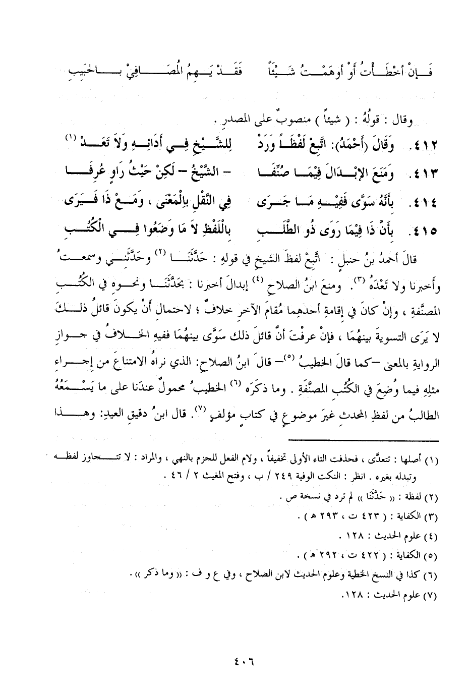 412.... وَقَالَ (أَحْمَدُ) : اتَّبِعْ لَفْظَاً وَرَدْ ... لِلشَّيْخِ فِي أَدَائِهِ وَلاَ تَعَدْ