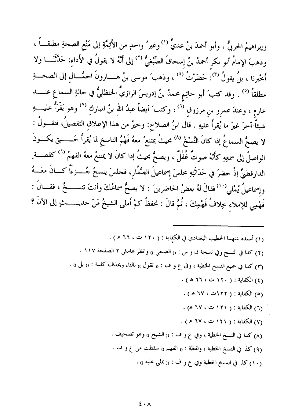 وإبراهيمُ الحربيُّ، وأبو أحمدَ بنُ عديٍّ وغيرُ واحدٍ من الأَئِمَّةِ إلى مَنْعِ الصحةِ مطلقاً، وذهبَ الإمامُ أبو بكرٍ أحمدُ بنُ إِسحاقَ الصِّبْغيُّ إلى أَنَّهُ لا يقولُ في الأَداءِ: حَدَّثَنَا ولا أَخْبرنا، بلُ يقولُ: حَضَرْتُ، وذهبَ موسى بنُ هارونَ الحمَّالِ إلى الصحةِ