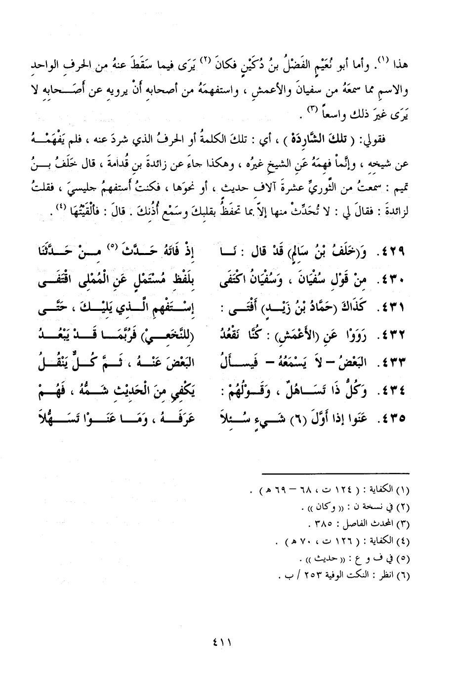 هذا. وأما أبو نُعَيْمٍ الفَضْلُ بنُ دُكَيْنٍ فكانَ يَرَى فيما سَقَطَ عنهُ من الحرفِ الواحدِ والاسمِ مما سمعَهُ من سفيانَ والأعمشِ، واستفهمَهُ من أصحابهِ أَنْ يرويهِ عن أَصَحابِهِ لا يَرَى غيرَ ذلك واسعاً.