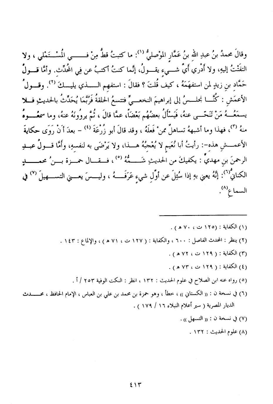 وقالَ محمدُ بنُ عبدِ اللهِ بنُ عَمَّارٍ الموْصليُّ: ما كتبتُ قطُّ مِنْ في المُسْتَمْلي، ولا التفَتْتُ إليهِ، ولا أَدْري أَيَّ شيءٍ يقولُ، إنَّما كنتُ أكتبُ عن فِي المحُدِّثِ. وأمَّا قولُ حَمَّادِ بنِ زيدٍ لمن استفهَمَهُ، كيف قُلتَ؟ فقالَ: استفهِم الذي يليكَ. وقولُ الأعمَشِ: كُنَّا نجلسُ إلى إبراهيمَ النخعيِّ فتتسعُ الحلقةُ فَرُبَّمَا يُحَدِّثُ بالحديثِ فلا يسمَعُهُ مَنْ تَنَحّى عنهُ، فَيَسْأَلُ بعضُهُم بَعْضَاً، عمَّا قالَ، ثُمَّ يروُونَهُ عنهُ، وما سمعُوهُ منهُ، فهذا وما أشبههُ تساهلٌ ممنْ فَعلَهُ، وقد قالَ أبو زُرْعَةَ - بعدَ أَنْ رَوَى حكايةَ الأعمشِ هذهِ-: رأيتُ أبا نُعَيمٍ لا يُعْجِبُهُ هذا، ولا يَرْضَى به لنفسِهِ، وأَمَّا قولُ عبدِ الرحمنَ بنِ مهديٍّ: يكفيكَ من الحديثِ شَمُّهُ، فقال حمزة بنُ محمدٍ الكنانيُّ: إنَّهُ يعني بهِ إذا سُئِلَ عن أوَّلِ شيءٍ عَرَفَهُ، وليسَ يعني التسهيلَ في السماعِ.