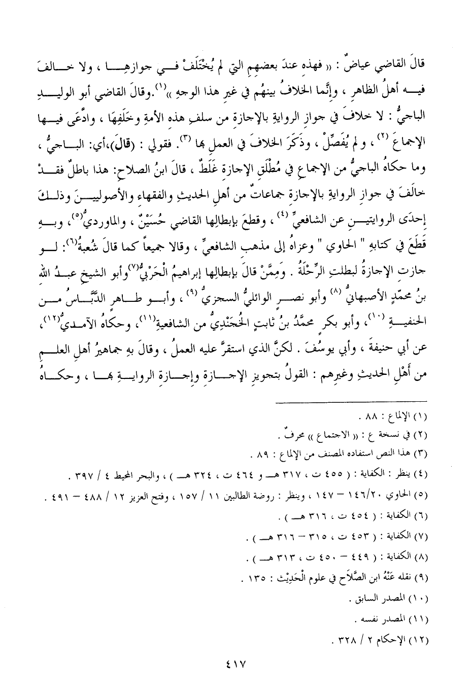 قالَ القاضي عياضٌ: ((فهذهِ عندَ بعضهِمِ التي لم يُخْتَلَفْ في جوازهِا، ولا خالفَ فيه أهلُ الظاهرِ، وإِنَّما الخلافُ بينهُم في غيرِ هذا الوجهِ)) . وقالَ القاضي أبو الوليدِ الباجيُّ: لا خلافَ في جوازِ الروايةِ بالإجازةِ من سلفِ هذهِ الأمةِ وخَلَفِهَا، وادَّعَى فيها الإجماعَ، ولم يُفَصِّلْ، وذَكَرَ الخلافَ في العملِ بها. فقولي: (قالَ) ، أي: الباجيُّ، وما حكاهُ الباجيُّ من الإجماعِ في مُطْلَقِ الإجازةِ غَلَطٌ، قالَ ابنُ الصلاحِ: هذا باطلٌ فقدْ خالَفَ في جوازِ الروايةِ بالإجازةِ جماعاتٌ من أهلِ الحديثِ والفقهاءِ والأصوليينَ وذلكَ إِحدَى الروايتينِ عن الشافعيِّ، وقطعَ بإبطالِها القاضي حُسَيْنٌ، والماورديُّ، وبهِ قَطَعَ في كتابهِ " الحاوي " وعزاهُ إلى مذهبِ الشافعيِّ، وقالا جميعاً كما قالَ شُعبةُ: لو جازتِ الإجازةُ لبطلتِ الرِّحْلَةُ. وَمِمَّنْ قالَ بإبطالِها إبراهيمُ الْحَرْبيُّوأبو الشيخِ عبدُ اللهِ بنُ محمّدٍ الأصبهانيُّ وأبو نصرٍ الوائليُّ السجزيُّ، وأبو طاهرٍ الدَّبَّاسُ من الحنفيةِ، وأبو بكرٍ محمَّدُ بنُ ثابتٍ الخُجَنْدِيُّ من الشافعيةِ، وحكاهُ الآمديُّ، عن أبي حنيفةَ، وأبي يوسُفَ. لكنَّ الذي استقرَّ عليه العملُ، وقالَ بهِ جماهيرُ أهلِ العلمِ من أَهْلِ الحديثِ وغيرِهم: القولُ بتجويزِ الإجازةِ وإِجازةِ الروايةِ بها، وحكاهُ