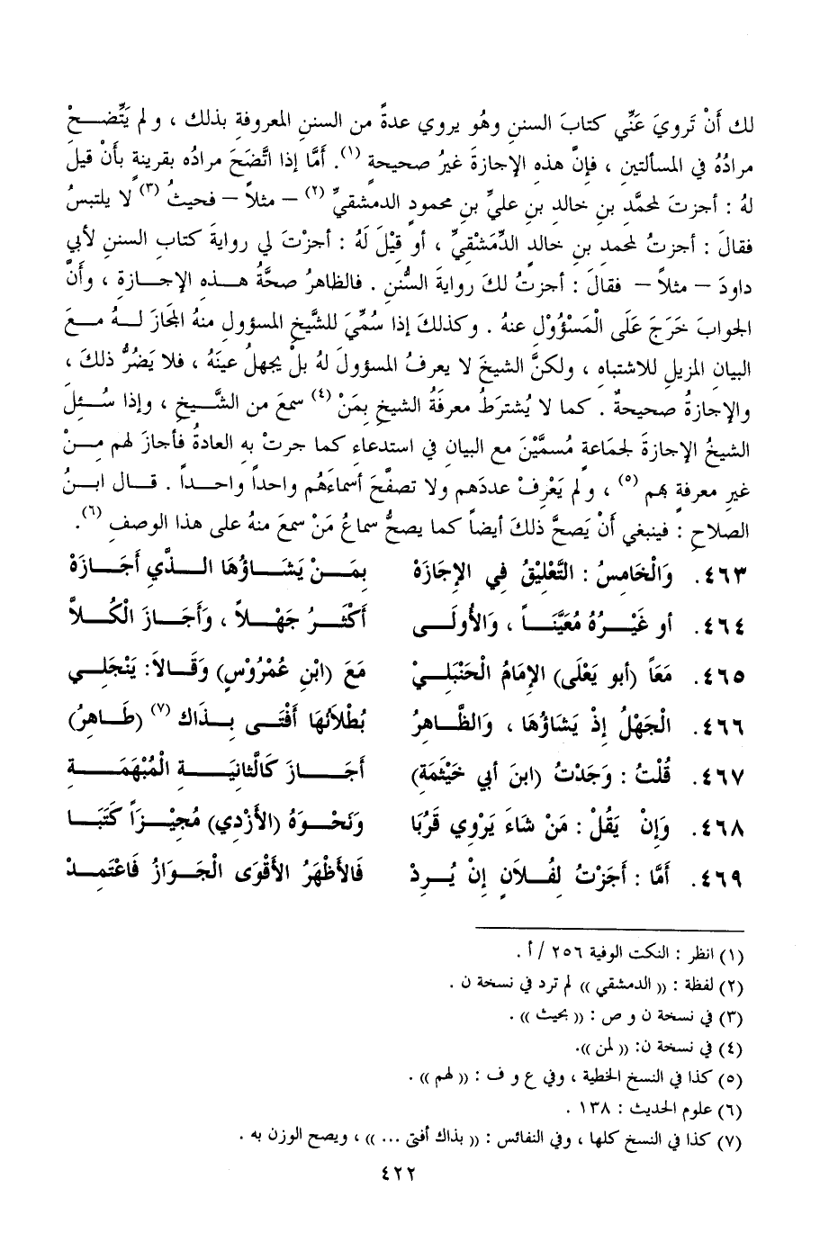 463.... وَالْخَامِسُ: التَّعْلِيْقُ فِي الإِجَازَهْ ... بِمَنْ يَشَاؤُهَا الذَّيِ أَجَازَهْ