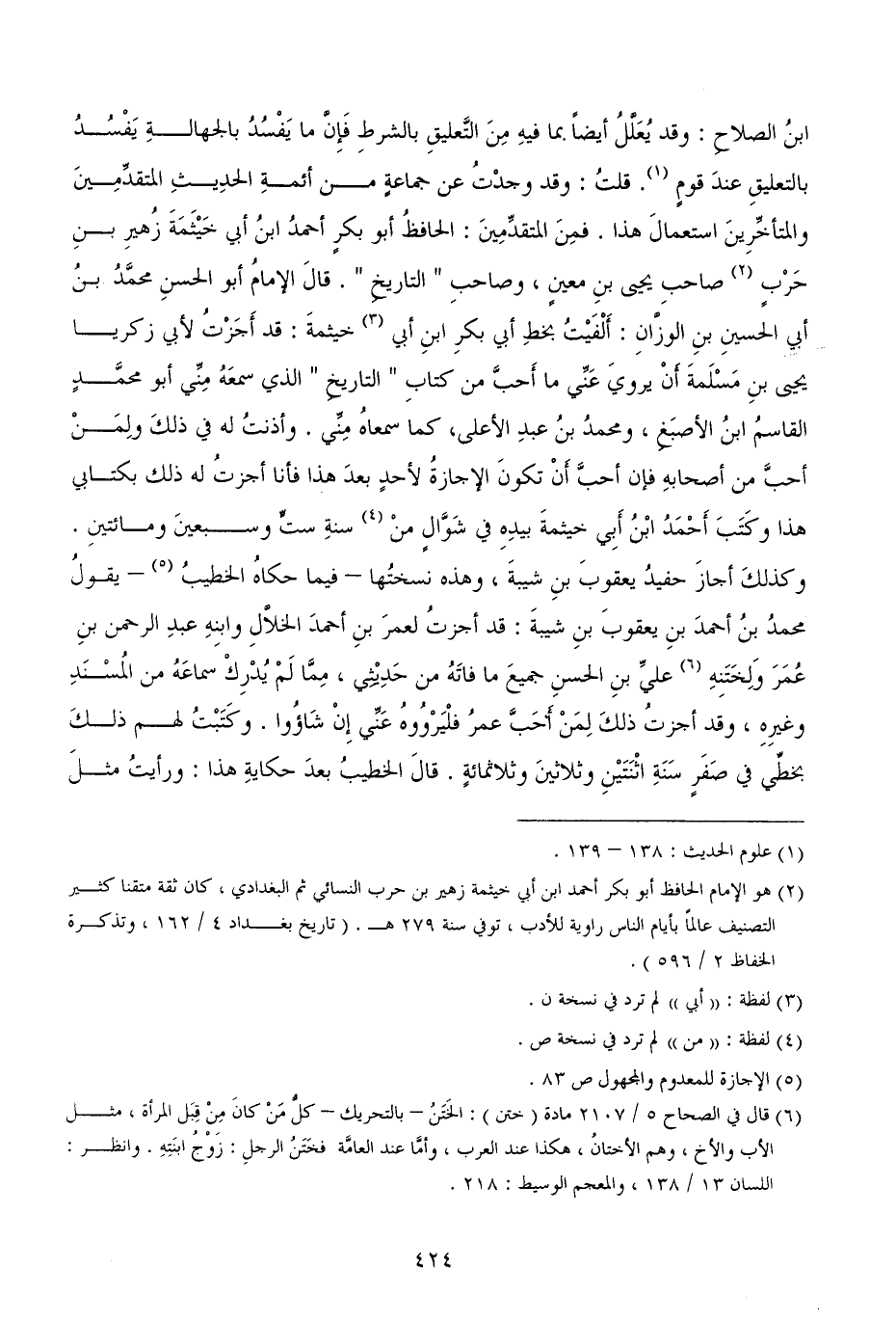 ابنُ الصلاحِ: وقد يُعَلَّلُ أيضاً بما فيهِ مِنَ التَّعليقِ بالشرطِ فَإِنَّ ما يَفْسُدُ بالجهالةِ يَفْسُدُ بالتعليقِ عندَ قومٍ. قلتُ: وقد وجدْتُ عن جماعةٍ من أئمةِ الحدِيثِ المتقدِّمِينَ والمتأخِّرِينَ استعمالَ هذا. فمِنَ المتقدِّمِينَ: الحافظُ أبو بكرٍ أحمدُ ابنُ أبي خَيْثَمَةَ زُهيرِ بنِ حَرْبٍ صاحبِ يحيى بنِ معينٍ، وصاحبِ " التاريخِ ". قالَ الإمامُ أبو الحسنِ محمَّدُ ابنُ أبي الحسينِ بنِ الوزَّانِ: أَلْفَيْتُ بخطِ أبي بكرِ ابنِ أبي خيثمةَ: قد أَجَزْتُ لأبي زكريا يحيى بنِ مَسْلَمةَ أَنْ يرويَ عَنِّي ما أَحبَّ من كتابِ " التاريخِ " الذي سمعَهُ مِنِّي أبو محمَّدٍ القاسمُ ابنُ الأصبَغِ، ومحمدُ بنُ عبدِ الأعلى، كما سمعاهُ مِنِّي. وأذنتُ له في ذلكَ ولِمَنْ أحبَّ من أصحابهِ فإن أحبَّ أَنْ تكونَ الإجازةُ لأحدٍ بعدَ هذا فأنا أجزتُ له ذلك بكتابي هذا وكَتَبَ أَحْمَدُ ابْنُ أَبِي خيثمةَ بيدِهِ في شَوَّالٍ منْ سنةِ ستٍّ وسبعينَ ومائتينِ. وكذلكَ أجازَ حفيدُ يعقوبَ بنِ شيبةَ، وهذه نسختُها - فيما حكاهُ الخطيبُ - يقولُ محمدُ بنُ أحمدَ بنِ يعقوبَ بنِ شيبةَ: قد أجزتُ لعمرَ بنِ أحمدَ الخلاَّلِ وابنِهِ عبدِ الرحمن بنِ عُمَرَ وَلِخَتَنِهِ عليِّ بنِ الحسنِ جميعَ ما فاتَهُ من حَدِيْثِي، مِمَّا لَمْ يُدْرِكْ سماعَهُ من المُسْنَدِ وغيرِهِ، وقد أجزتُ ذلكَ لِمَنْ أَحَبَّ عمرُ فلْيَرْوُوهُ عَنِّي إِنْ شَاؤُوا. وكَتَبْتُ لهم ذلكَ بخطِّي في صَفَرٍ سَنَةِ اثْنَتَيْنِ وثلاثينَ وثلاثمائةٍ. قالَ الخطيبُ بعدَ حكايةِ هذا: ورأيتُ مثلَ
