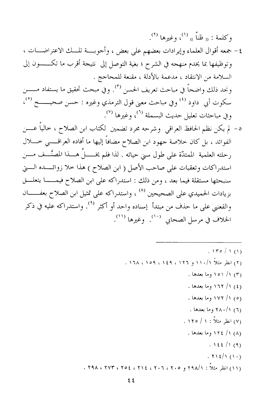5- لم يكن نظم الحافظ العراقي وشرحه مجرد تضمين لكتاب ابن الصلاح، خالياً عن الفوائد، بل كان خلاصة جهود ابن الصلاح مضافاً إليها ما أفاده العراقي خلال رحلته العلمية الممتدّة على طول سني حياته. لذا فلم يخلُ هذا المصنَّف من استدراكات وتعقبات على صاحب الأصل (ابن الصلاح) هذا خلا زوائده التي سنبحثها مستقلة فيما بعد، ومن ذلك: استدراكه على ابن الصلاح فيما يتعلق بزيادات الحميدي على الصحيحين (¬8) ، واستدراكه على تمثيل ابن الصلاح بعفان والقعنبي على ما حذف من مبتدأ إسناده واحد أو أكثر (¬9) . واستدراكه عليه في ذكر الخلاف في مرسل الصحابي (¬10) . وغيرها (¬11) .