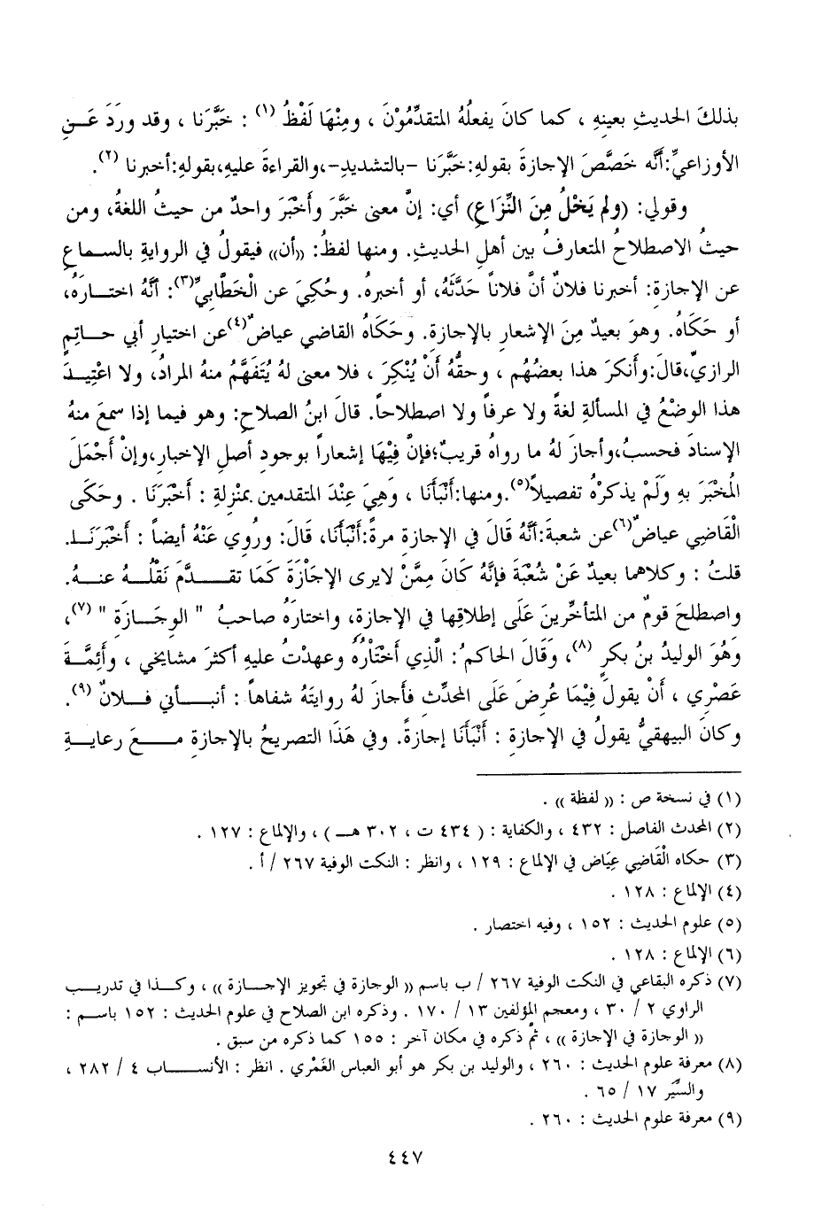وقولي: (ولم يَخْلُ مِنَ النِّزَاعِ) أي: إنَّ معنى خَبَّرَ وأَخْبَرَ واحدٌ من حيثُ اللغةُ، ومن حيثُ الاصطلاحُ المتعارفُ بين أهلِ الحديثِ. ومنها لفظُ: ((أن)) فيقولُ في الروايةِ بالسماعِ عن الإجازةِ: أخبرنا فلانٌ أنَّ فلاناً حَدَّثَهُ، أو أخبرهُ. وحُكِيَ عن الْخَطَّابِيِّ: أنَّهُ اختارَهُ، أو حَكَاهُ. وهوَ بعيدٌ مِنَ الإشعارِ بالإجازةِ. وحَكَاهُ القاضي عياضٌعن اختيارِ أبي حاتِمٍ الرازيِّ، قالَ: وأَنكرَ هذا بعضُهُم، وحقُّهُ أَنْ يُنْكِرَ، فلا معنى لهُ يُتَفَهَّمُ منهُ المرادُ، ولا اعْتِيدَ هذا الوضْعُ في المسألةِ لغةً ولا عرفاً ولا اصطلاحاً. قالَ ابنُ الصلاحِ: وهو فيما إذا سمعَ منهُ الإسنادَ فحسبُ، وأجازَ لهُ ما رواهُ قريبٌ؛ فإنَّ فِيْهَا إشعاراً بوجودِ أصلِ الإخبارِ، وإنْ أَجْمَلَ المُخْبَرَ بهِ وَلَمْ يذكرْهُ تفصيلاً. ومنها: أَنْبَأَنَا، وَهِيَ عِنْدَ المتقدمين بمنْزِلةِ: أَخْبَرَنَا. وحَكَى الْقَاضِي عياضٌعن شعبةَ: أنَّهُ قَالَ في الإجازةِ مرةً: أَنْبَأَنَا، قَالَ: ورُوِي عَنْهُ أيضاً: أَخْبَرَنَا. قلتُ: وكلاهما بعيدٌ عَنْ شُعْبَةَ فإنَّهُ كَانَ مِمَّنْ لايرى الإجَاْزَةَ كَمَا تقدَّمَ نَقْلُهُ عنهُ. واصطلحَ قومٌ من المتأخِّرينَ عَلَى إطلاقِها في الإجازةِ، واختارَهُ صاحبُ " الوِجَازَةِ "، وَهُوَ الوليدُ بنُ بكرٍ، وَقَالَ الحاكمُ: الَّذِي أَخْتَاْرُهُ وعهدْتُ عليهِ أكثرَ مشايخي، وأَئِمَّةَ عَصْرِي، أَنْ يقولَ فِيْمَا عُرِضَ عَلَى المحدِّثِ فأَجازَ لهُ روايتَهُ شفاهاً: أنبأني فلانٌ. وكانَ البيهقيُّ يقولُ في الإجازةِ: أَنْبَأَنَا إجازةً. وفي هَذَا التصريحُ بالإجازةِ معَ رعايةِ