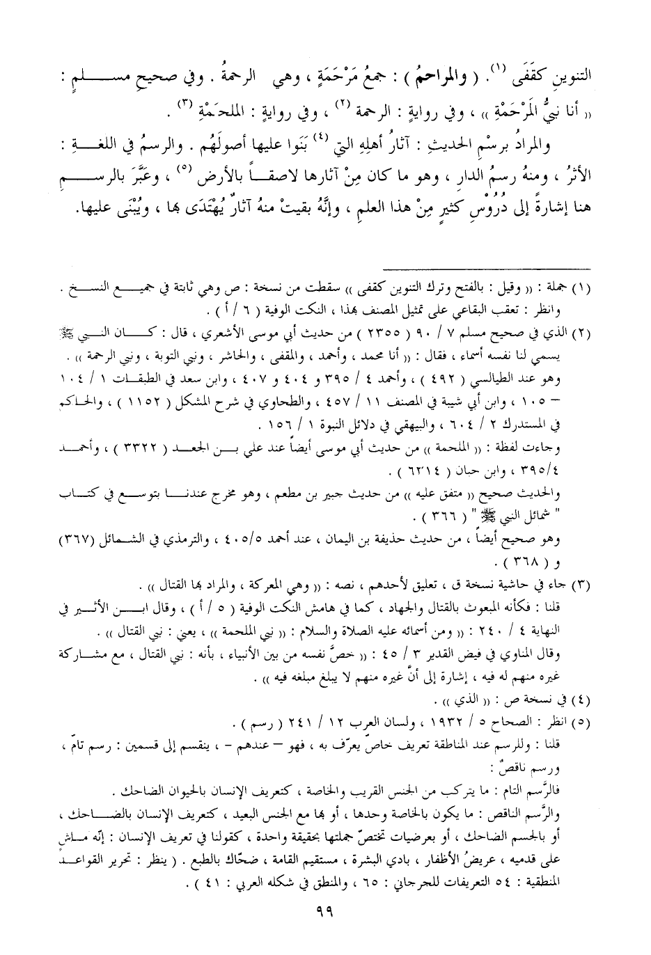 التنوينِ كقَفَى. (والمراحمُ) : جمعُ مَرْحَمَةٍ، وهي الرحمةُ. وفي صحيحِ مسلمٍ: ((أنا نبيُّ المَرْحَمْةِ)) ، وفي روايةٍ: الرحمة، وفي روايةٍ: الملحَمْةِ.