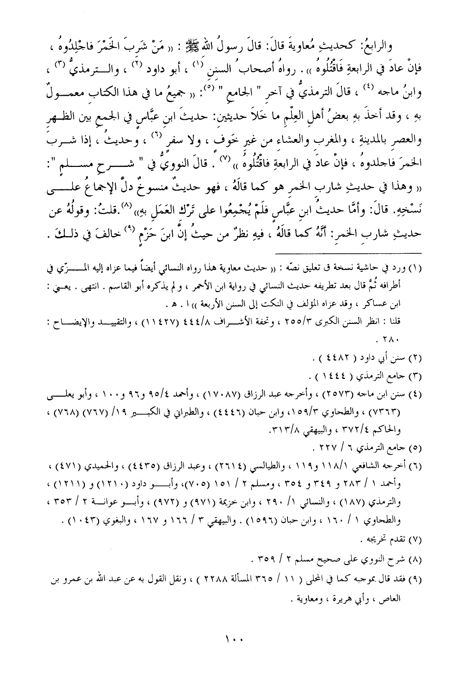 والرابعُ كحديثِ مُعاويةَ قالَ قالَ رسولُ اللهِ - صَلَّى اللهُ عَلَيْهِ وَسَلَّمَ - مَنْ شَرِبَ الخَمْرَ فاجْلِدُوهُ، فإنْ عادَ في الرابعةِ فَاقْتُلُوهُ رواهُ أصحابُ السنِنِ، أبو داود، والترمذيُّ، وابنُ ماجه، قالَ الترمذيُّ في آخرِ الجامعِ جميعُ ما في هذا الكتابِ معمولٌ بهِ، وقد أخذَ بهِ بعضُ أهلِ العِلْمِ ما خَلاَ حديثينِ حديثَ ابنِ عبَّاسٍ في الجمعِ بين الظهرِ والعصرِ بالمدينةِ، والمغربِ والعشاءِ من غيرِ خَوفٍ، ولا سفرٍ، وحديثُ، إذا شربَ الخمرَ فاجلدوهُ، فإنْ عادَ في الرابعةِ فاقْتُلُوهُ)) . قالَ النوويُّ في " شرحِ مسلمٍ ": ((وهذا في حديثِ شاربِ الخمرِ هو كما قالَهُ، فهو حديثٌ منسوخٌ دلَّ الإجماعُ على نَسْخِهِ. قالَ: وأمَّا حديثُ ابنِ عبَّاسٍ فلَمْ يُجْمِعُوا على تَرْكِ العَمَلِ بهِ)) . قلتُ: وقولُهُ عن حديثِ شاربِ الخمرِ: أنَّهُ كما قالَهُ، فيهِ نظرٌ من حيثُ إنَّ ابنَ حَزْمٍ خالفَ في ذلكَ.