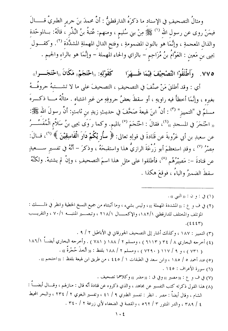 أي وقد أطلقَ مَنْ صنَّفَ في التصحيفِ، التصحيفَ على ما لا تشتبِهُ حروفُهُ بغيرِهِ، وإنَّمَا أخطأَ فيه راويهِ، أو سقطَ بعضُ حروفِهِ من غيرِ اشتباهٍ مثالُهُ ما ذكرهَ مسلمٌ في التمييزِ أنَّ ابنَ لهيعةَ صَحَّفَ في حديثِ زيدِ بنِ ثابتٍ أنَّ رسولَ اللهِ - صَلَّى اللهُ عَلَيْهِ وَسَلَّمَ - احْتَجَرَ في المسجدِ، فقالَ احْتَجَمَ بالميمِ وكما رَوَى يحيى بنُ سَلاَّمٍ الْمُفَسِّرُ عن سعيدِ بن أبي عَرُوبةَ عن قَتَادةَ في قولِهِ تعالى {سأُرِيْكُمْ دَارَ الْفَاسِقِيْنَ} ، قالَ مِصْرُ، وقدِ استعظمَ أبو زُرْعَةَ الرازيُّ هذا واستقبحَهُ، وذكرَ أنَّهُ في تفسيرِ سعيدٍ عن قتادةَ مَصِيْرُهُم، فأطلقوا على مثلِ هذا اسمَ التصحيفِ، وإنْ لم يشتبهْ. ولكنَّهُ سقطَ الضميرُ والياءُ، فوقعَ هكذا.