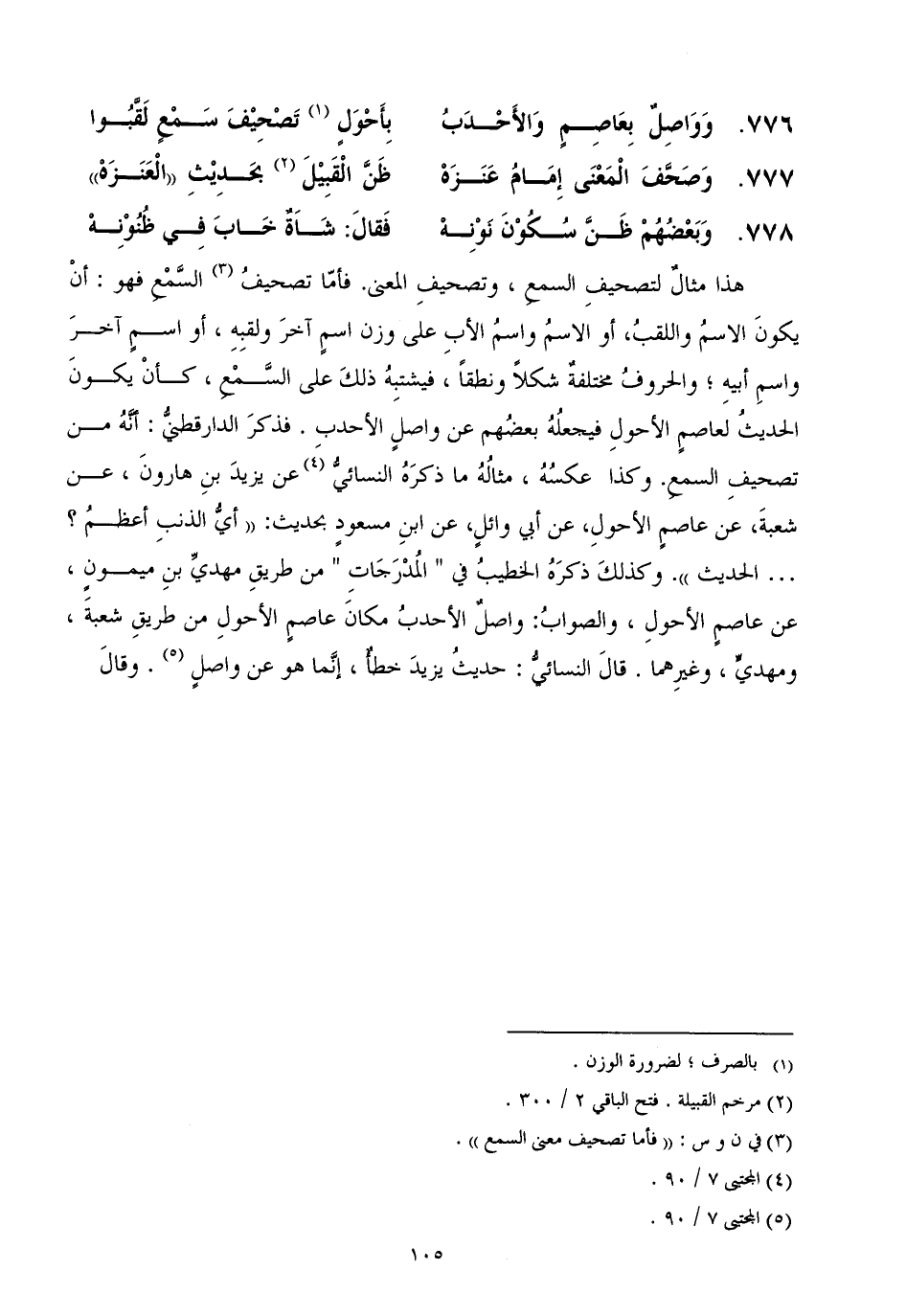 776.... وَوَاصِلٌ بِعَاصِمٍ وَالأَحْدَبُ ... بِأَحْوَلٍ تَصْحِيْفَ سَمْعٍ لَقَّبُوا
