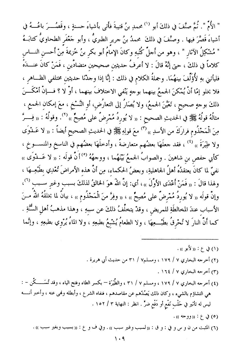 الأُمِّ ". ثُمَّ صنَّفَ في ذلكَ أبو محمدِ بنُ قتيبةَ فأَتى بأشياءَ حسنةٍ، وقَصُرَ باعُهُ في أشياءَ قَصَّرَ فيها. وصنَّفَ في ذلكَ محمدُ بنُ جريرٍ الطبريُّ، وأبو جَعْفَرٍ الطحاويُّ كتابَهُ " مُشْكِلُ الآثارِ "، وهو من أَجلِّ كُتُبِهِ وكانَ الإمامُ أبو بكرِ بنُ خُزيمةَ مِنْ أَحسنِ الناسِ كلاماً في ذلكَ، حتى إنَّهُ قالَ: لا أعرفُ حديثينِ صحيحينِ متضادَّينِ، فَمَنْ كانَ عندَهُ فليأتني بهِ لأُؤَلِّفَ بينهُمَا.