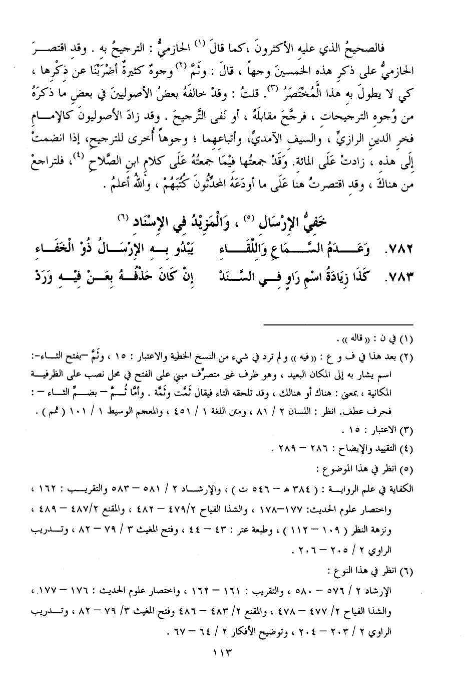فالصحيحُ الذي عليهِ الأكثرونَ، كما قالَ الحازميُّ: الترجيحُ بهِ. وقدِ اقتصرَ الحازميُّ على ذكرِ هذهِ الخمسينَ وجهاً، قالَ: وثَمَّ وجوهٌ كثيرةٌ أضْرَبْنَا عن ذِكْرِها، كي لا يطولَ بهِ هذا الْمُخْتَصَرُ. قلتُ: وقدْ خالفَهُ بعضُ الأصوليينَ في بعضِ ما ذكرَهُ من وُجوهِ الترجيحاتِ، فرجَّحَ مقابلَهُ، أو نَفى التَّرجيحَ. وقد زادَ الأصوليونَ كالإمامِ فخرِ الدينِ الرازيِّ، والسيفِ الآمديِّ، وأتباعِهِما؛ وجوهاً أُخرى للترجيحِ، إذا انضمتْ إِلَى هذهِ، زادتْ عَلَى المائةِ. وَقَدْ جمعتُها فِيْمَا جمعتُهُ عَلَى كلامِ ابنِ الصَّلاحِ، فلتراجعْ من هناكَ، وقدِ اقتصرتُ هنا عَلَى ما أودَعَهُ المحدِّثُونَ كُتُبَهُمْ، واللهُ أعلمُ.