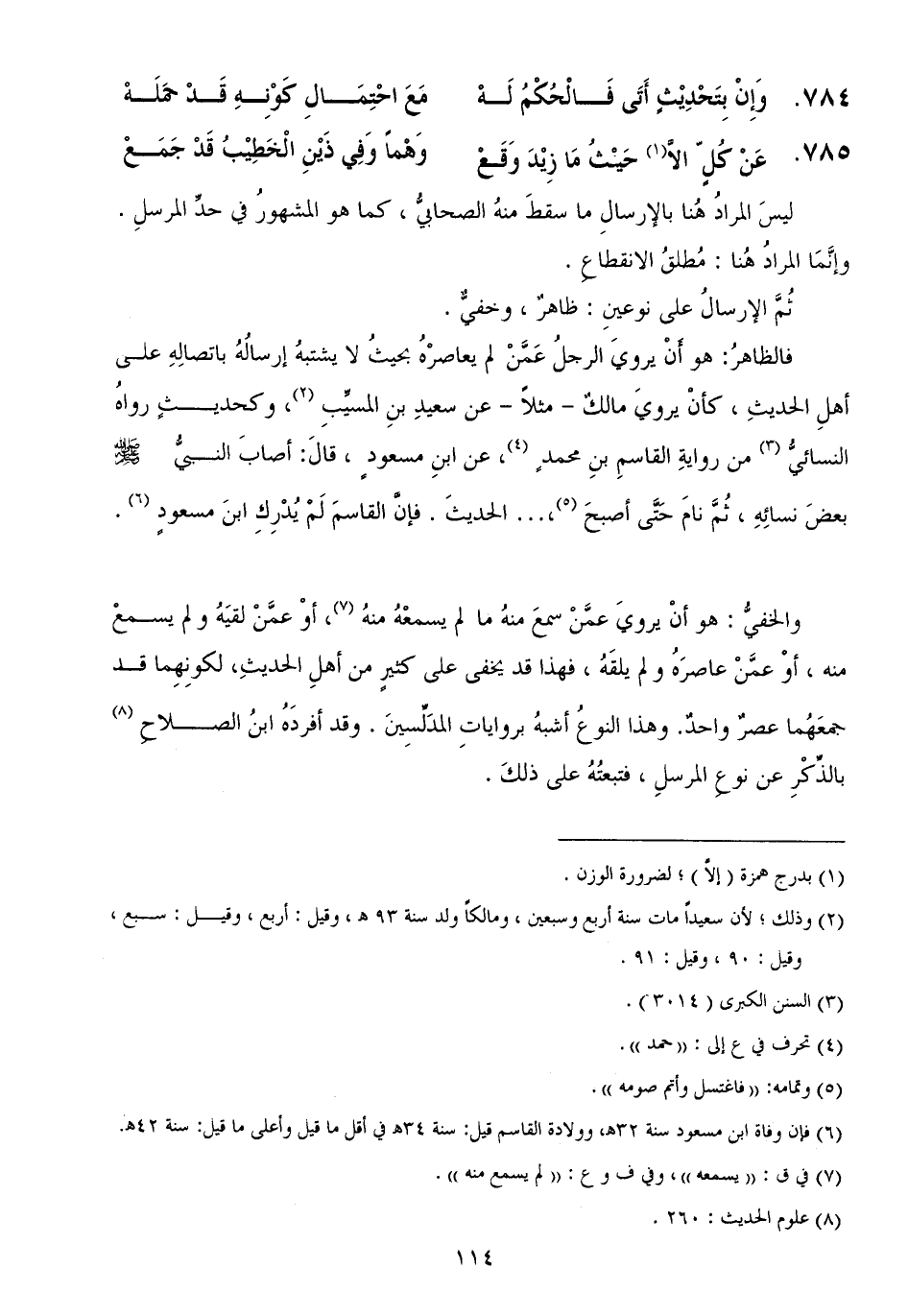 فالظاهرُ هو أَنْ يرويَ الرجلُ عَمَّنْ لم يعاصرْهُ بحيثُ لا يشتبهُ إرسالُهُ باتصالِهِ على أهلِ الحديثِ، كأنْ يرويَ مالكٌ مثلاً عن سعيدِ بنِ المسيِّبِ، وكحديثٍ رواهُ النسائيُّ من روايةِ القاسمِ بنِ محمدٍ، عن ابنِ مسعودٍ، قالَ أصابَ النبيُّ - صَلَّى اللهُ عَلَيْهِ وَسَلَّمَ - بعضَ نسائِهِ، ثُمَّ نامَ حَتَّى أصبحَ، ... الحديثَ فإنَّ القاسمَ لَمْ يُدْرِكِ ابنَ مسعودٍ.