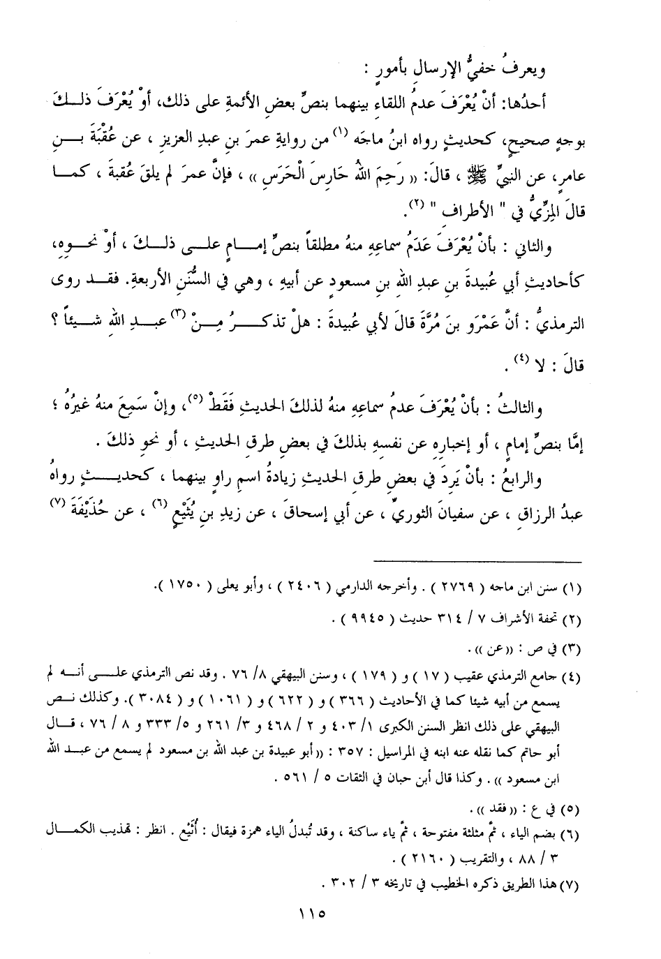 والثاني: بأنْ يُعْرَفَ عَدَمُ سماعِهِ منهُ مطلقاً بنصِّ إمامٍ على ذلكَ، أوْ نحوِهِ، كأحاديثِ أبي عُبيدةَ بنِ عبدِ اللهِ بنِ مسعودٍ عن أبيهِ، وهي في السُّنَنِ الأربعةِ. فقد روى الترمذيُّ: أنَّ عَمْرَو بنَ مُرَّةَ قالَ لأبي عُبيدةَ: هلْ تذكرُ مِنْ عبدِ اللهِ شيئاً؟ قالَ: لا.