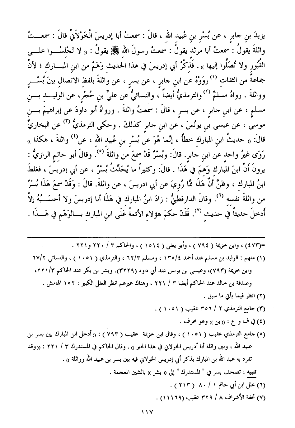 وسلم - يقولُ لا تَجْلِسُوا على القُبُورِ ولا تُصَلُّوا إليها فَذِكْرُ أبي إدريسَ في هذا الحديثِ وَهَمٌ من ابنِ المباركِ؛ لأنَّ جماعةً من الثقاتِ روَوْهُ عن ابنِ جابرٍ، عن بسرٍ، عن واثلةَ بلفظِ الاتصالِ بينَ بُسْرٍ وواثلةَ رواهُ مسلمٌ والترمذيُّ أيضاً، والنسائيُّ عن عليِّ بنِ حُجْرٍ، عن الوليدِ بنِ مسلمٍ، عن ابنِ جابرٍ، عن بسرٍ، قالَ سمعتُ واثلةَ ورواهُ أبو داودَ عن إبراهيمَ بنِ موسى، عن عيسى بنِ يونُسَ، عن ابنِ جابرٍ كذلكَ وحكى الترمذيُّ عن البخاريِّ قالَ حديثُ ابنِ المباركِ خطأٌ، إنَّما هُوَ عن بُسْرِ بنِ عُبيدِ اللهِ، عن واثلةَ، هكذا رَوَى غيرُ واحدٍ عن ابنِ جابرٍ قالَ وبُسْرٌ قَدْ سمعَ من واثلةَ وقالَ أبو حاتِمٍ الرازيُّ يرونَ أَنَّ ابنَ المباركِ وَهِمَ في هَذَا قالَ وكثيراً ما يُحَدِّثُ بُسْرٌ، عن أبي إدريسَ، فغلطَ ابنُ المباركِ، وظنَّ أنَّ هَذَا ممَّا رُوِيَ عن أبي ادريسَ، عن واثلةَ قالَ وَقَدْ سمعَ هَذَا بُسْرٌ من واثلةَ نفسِهِ وقالَ الدارقطنيُّ زادَ ابنُ المباركِ في هَذَا أبا إدريسَ ولا أحسَبُهُ إلاَّ أَدخلَ حديثاً في حديثٍ فَقَدْ حكمَ هؤلاءِ الأئمةُ عَلَى ابنِ المباركِ بالوَهْمِ في هَذَا