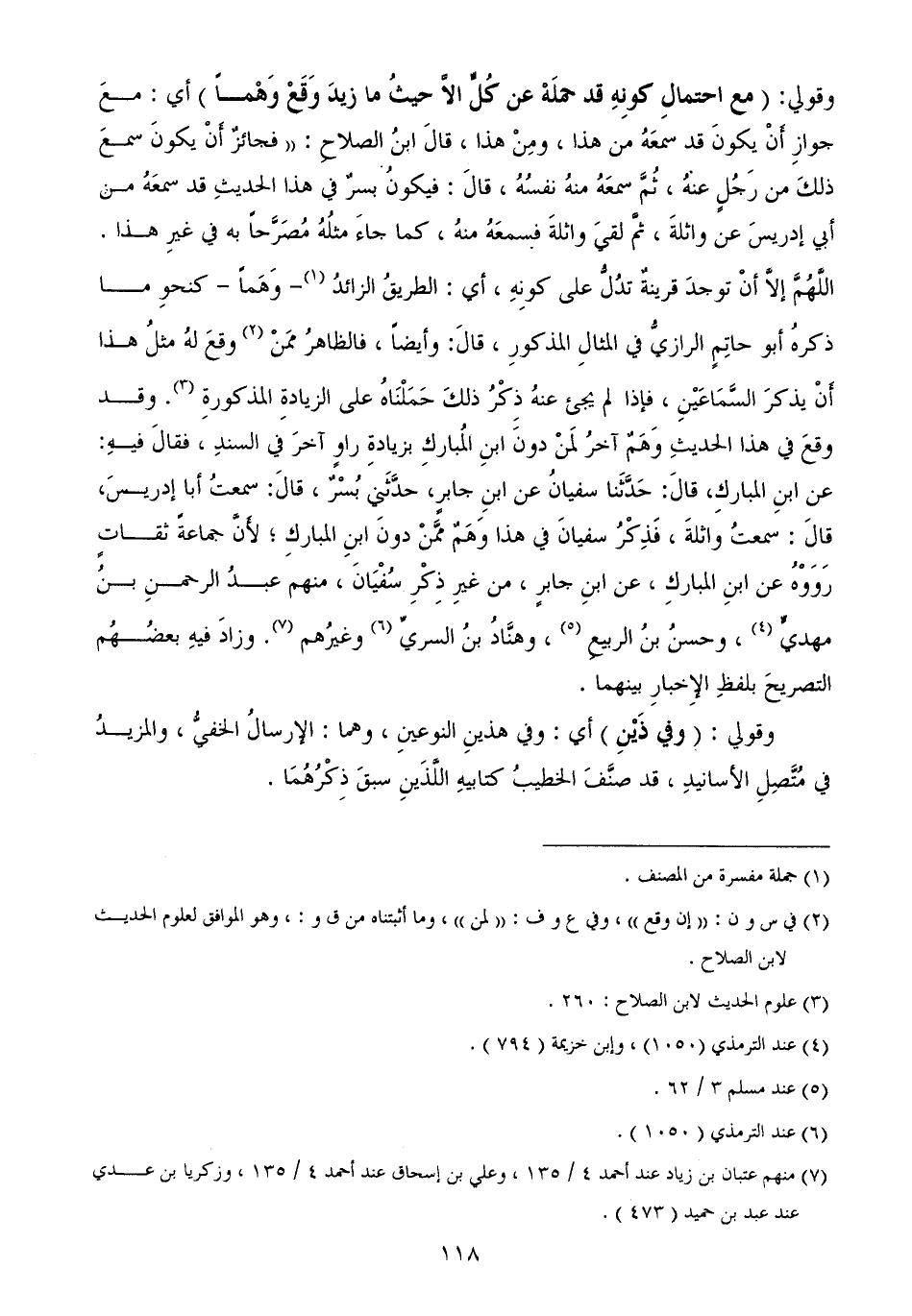 اللَّهُمَّ إلاَّ أنْ توجدَ قرينةٌ تدُلُّ على كونِهِ، أي: الطريقُ الزائدُ - وَهَماً - كنحوِ ما ذكرهُ أبو حاتِمٍ الرازيُّ في المثالِ المذكورِ، قالَ: وأيضاً، فالظاهرُ ممَنْ وقعَ لهُ مثلُ هذا أَنْ يذكرَ السَّمَاعَيْنِ، فإذا لم يجئ عنهُ ذِكْرُ ذلكَ حَمَلْنَاهُ على الزيادةِ المذكورةِ. وقد وقعَ في هذا الحديثِ وَهَمٌ آخرُ لمَنْ دونَ ابنِ المُباركِ بزيادةِ راوٍ آخرَ في السندِ، فقالَ فيهِ: عن ابنِ المباركِ، قالَ: حَدَّثَنا سفيانُ عن ابنِ جابرٍ، حدَّثَني بُسْرٌ، قالَ: سمعتُ أبا إدريسَ، قالَ: سمعتُ واثلةَ، فَذِكْرُ سفيانَ في هذا وَهَمٌ ممَّنْ دونَ ابنِ المباركِ؛ لأَنَّ جماعةً ثقاتٍ رَوَوْهُ عن ابنِ المباركِ، عن ابنِ جابرٍ، من غيرِ ذِكْرِ سُفْيَانَ، منهم عبدُ الرحمنِ بنُ مهديٍّ، وحسنُ بنُ الربيعِ، وهنَّادُ بنُ السريِّ وغيرُهم. وزادَ فيهِ بعضُهُم التصريحَ بلفظِ الإِخبارِ بينهما.