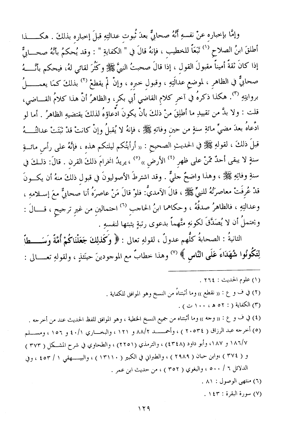 الثانيةُ: الصحابةُ كلُّهم عدولٌ، لقولهِ تعالى: {وَكَذلِكَ جَعَلْنَاكُمْ أُمَّةً وَسَطاً لِتَكُونُوا شُهَدَاءَ عَلَى النَّاسِ} وهذا خطابٌ مع الموجودينَ حينَئذٍ، ولقولهِ تعالى: