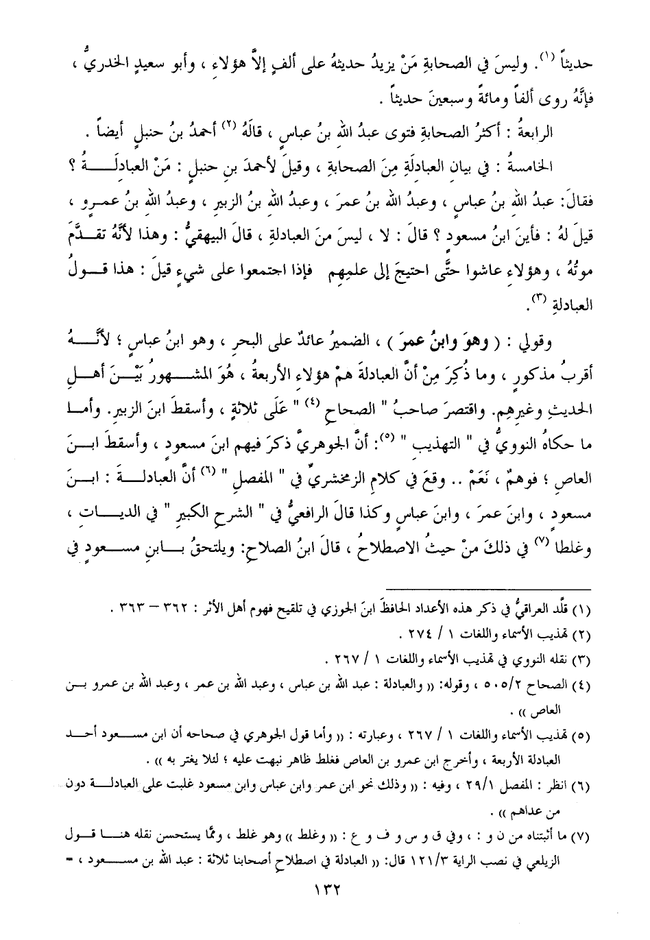 الخامسةُ: في بيانِ العبادِلَةِ مِنَ الصحابةِ، وقيلَ لأحمدَ بنِ حنبلٍ: مَنْ العبادِلَةُ؟ فقالَ: عبدُ اللهِ بنُ عباسٍ، وعبدُ الله بنُ عمرَ، وعبدُ اللهِ بنُ الزبيرِ، وعبدُ اللهِ بنُ عمرٍو، قيلَ لهُ: فأينَ ابنُ مسعودٍ؟ قالَ: لا، ليسَ منَ العبادلةِ، قالَ البيهقيُّ: وهذا لأنَّهُ تقدَّمَ موتُهُ، وهؤلاءِ عاشوا حتَّى احتيجَ إلى علمِهِم فإذا اجتمعوا على شيءٍ قيلَ: هذا قولُ العبادلةِ.