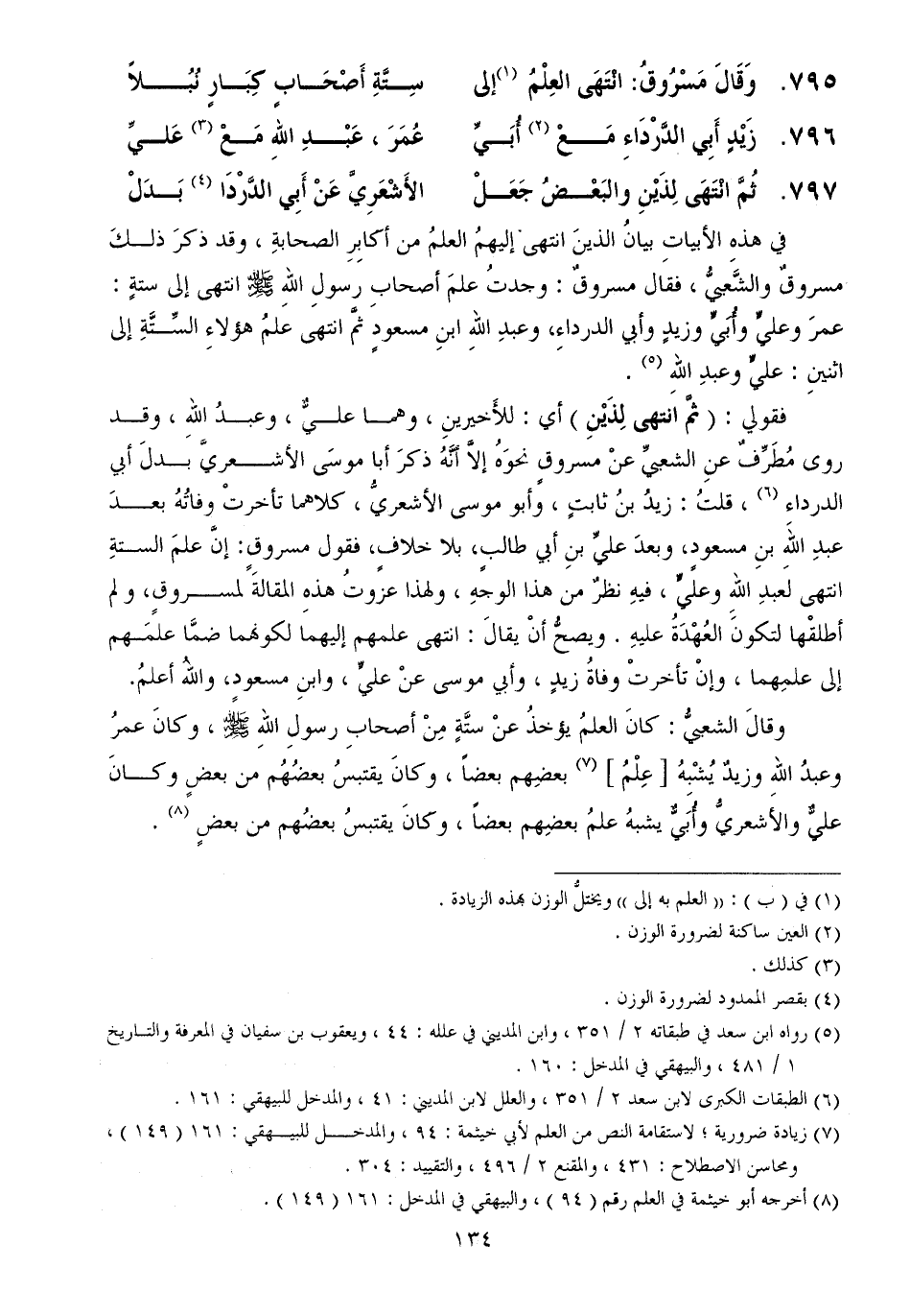 795.... وَقَالَ مَسْرُوقُ انْتَهَى العِلْمُ إلى ... سِتَّةِ أَصْحَابٍ كِبَارٍ نُبُلاً