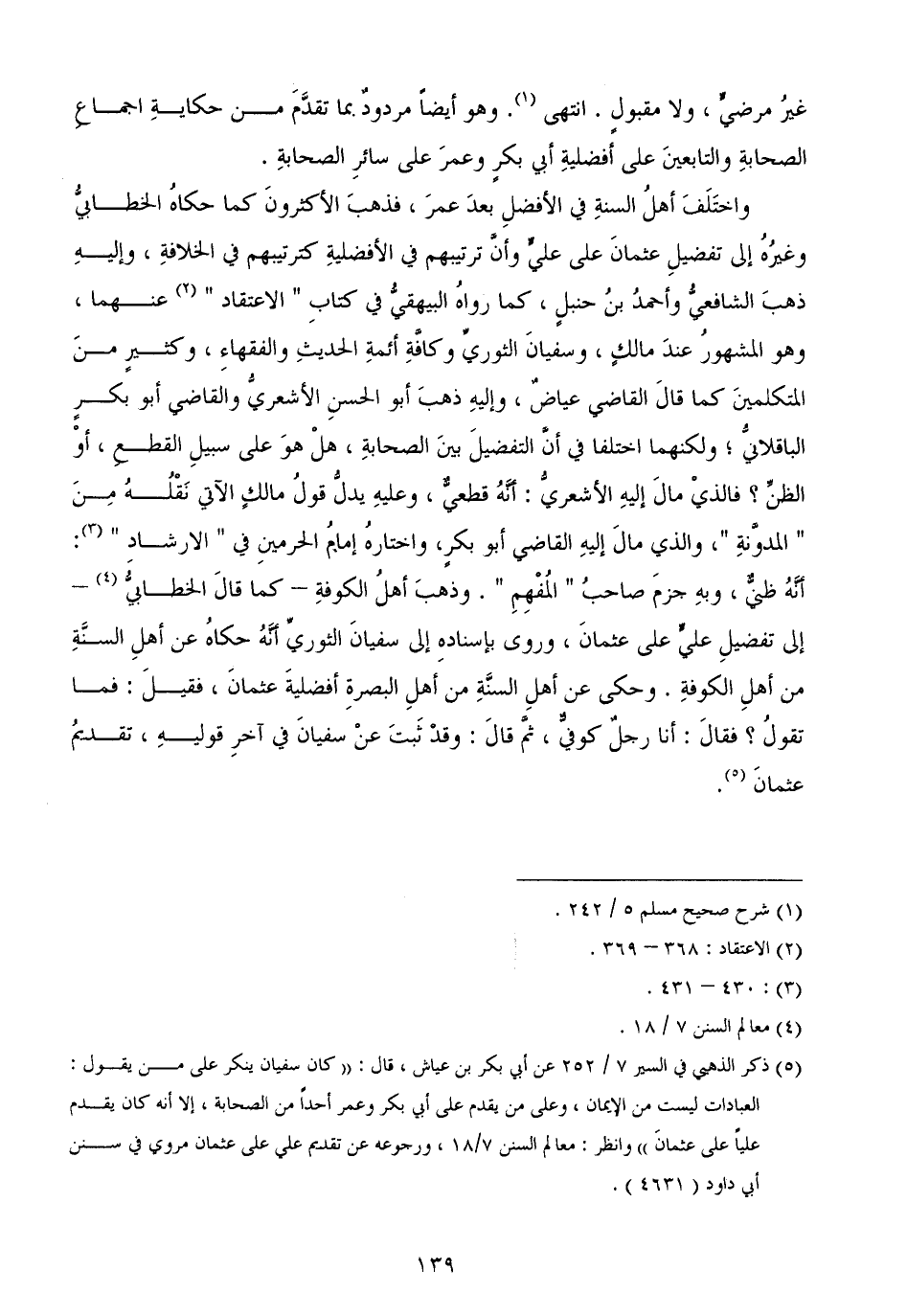 واختَلَفَ أهلُ السنةِ في الأفضلِ بعدَ عمرَ، فذهبَ الأكثرونَ كما حكاهُ الخطابيُّ وغيرُهُ إلى تفضيلِ عثمانَ على عليٍّ وأنَّ ترتيبهم في الأفضليةِ كترتيبهم في الخلافةِ، وإليهِ ذهبَ الشافعيُّ وأحمدُ بنُ حنبلٍ، كما رواهُ البيهقيُّ في كتابِ الاعتقاد عنهما، وهو المشهورُ عندَ مالكٍ، وسفيانَ الثوريِّ وكافَّةِ أئمةِ الحديثِ والفقهاءِ، وكثيرٍ منَ المتكلمينَ كما قالَ القاضي عياضٌ، وإليهِ ذهبَ أبو الحسنِ الأشعريُّ والقاضي أبو بكرٍ الباقلانيُّ؛ ولكنهما اختلفا في أنَّ التفضيلَ بينَ الصحابةِ، هلْ هوَ على سبيلِ القطعِ، أوْ الظنِّ؟ فالذيْ مالَ إليهِ الأشعريُّ أنَّهُ قطعيٌّ، وعليهِ يدلُّ قولُ مالكٍ الآتي نَقْلُهُ مِنَ المدوَّنةِ، والذي مالَ إليهِ القاضي أبو بكرٍ، واختارهُ إمامُ الحرمينِ في الارشادِ أنَّهُ ظنيٌّ، وبهِ جزمَ صاحبُ المُفْهِمِ وذهبَ أهلُ الكوفةِ - كما قالَ الخطابيُّ - إلى تفضيلِ عليٍّ على عثمانَ، وروى بإسنادهِ إلى سفيانَ الثوريِّ أنَّهُ حكاهُ عن أهلِ السنَّةِ من أهلِ الكوفةِ وحكى عن أهلِ السنَّةِ من أهلِ البصرةِ أفضليةَ عثمانَ، فقيلَ فما تقولُ؟ فقالَ أنا رجلٌ كوفيٌّ، ثمَّ قالَ وقدْ ثَبتَ عنْ سفيانَ في آخرِ قوليهِ، تقديمُ عثمانَ