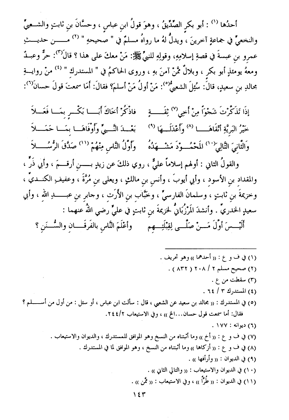 أحدُها أبو بكرٍ الصِّدِّيقُ، وهوَ قولُ ابنِ عباسٍ، وحسَّانَ بنِ ثابتٍ والشعبيِّ والنخعيِّ في جماعةٍ آخرينَ، ويدلُّ لهُ ما رواهُ مسلمٌ في صحيحهِ من حديثِ عمرِو بنِ عبسةَ في قصةِ إسلامِهِ، وقولِهِ للنبيِّ - صَلَّى اللهُ عَلَيْهِ وَسَلَّمَ - مَنْ معكَ على هذا؟ قالَ حرٌّ وعبدٌ ومعهُ يومئذٍ أبو بكرٍ، وبلالٌ ممَّنْ آمنَ بهِ، وروى الحاكمُ في المستدركِ منْ روايةِ مجالدِ بنِ سعيدٍ، قالَ سُئِلَ الشعبيُّ مَنْ أولُ مَنْ أسلمَ؟ فقالَ أَمَا سمعتَ قولَ حسانَ