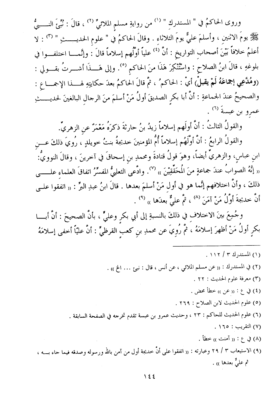 وروى الحاكمُ في المستدركِ من روايةِ مسلمٍ الملائيِّ، قالَ نُبِّئَ النبيُّ - صَلَّى اللهُ عَلَيْهِ وَسَلَّمَ - يومَ الاثنينِ، وأسلمَ عليٌّ يومَ الثلاثاءِ وقالَ الحاكمُ في علومِ الحديثِ لا أعلمُ خلافاً بَيْنَ أصحابِ التواريخِ أنَّ علياً أوَّلُهم إسلاماً قالَ وإنَّما اختلفوا في بلوغهِ، قالَ ابنُ الصلاحِ واسْتُنْكِرَ هَذَا منَ الحاكمِ وإلى هَذَا أشرتُ بقولي ومُدَّعِي إجماعَهُ لَمْ يقبلْ أيْ الحاكمُ، ثمَّ قالَ الحاكمُ بعدَ حكايتِهِ لهذا الإجماعِ والصحيحُ عندَ الجماعةِ أنَّ أبا بكرٍ الصديقَ أولُ مَنْ أسلمَ منَ الرجالِ البالغينَ لحديثِ عمرِو بن عبسةَ
