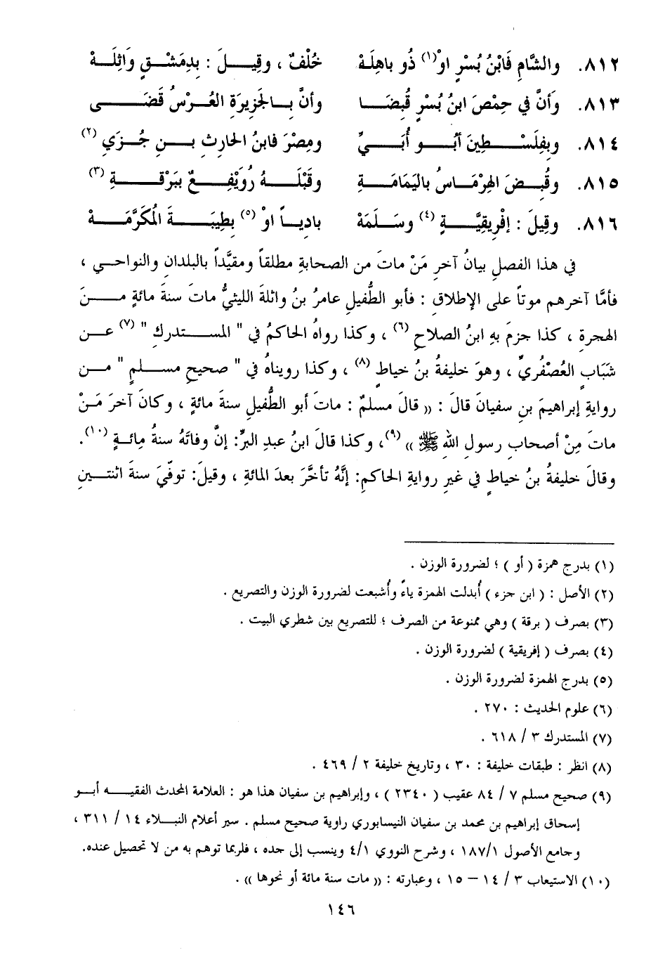 في هذا الفصلِ بيانُ آخرِ مَنْ ماتَ من الصحابةِ مطلقاً ومقيَّداً بالبلدانِ والنواحي، فأمَّا آخرهم موتاً على الإطلاقِ: فأبو الطُّفيلِ عامرُ بنُ واثلةَ الليثيُّ ماتَ سنةَ مائةٍ منَ الهجرةِ، كذا جزمَ بهِ ابنُ الصلاحِ، وكذا رواهُ الحاكمُ في " المستدركِ " عن شَبَابٍ العُصْفُريِّ، وهوَ خليفةُ بنُ خياطٍ، وكذا رويناهُ في " صحيحِ مسلمٍ " من روايةِ إبراهيمَ بنِ سفيانَ قالَ: ((قالَ مسلمٌ: ماتَ أبو الطُّفيلِ سنةَ مائةٍ، وكانَ آخرَ مَنْ ماتَ مِنْ أصحابِ رسولِ اللهِ - صَلَّى اللهُ عَلَيْهِ وَسَلَّمَ -)) ، وكذا قالَ ابنُ عبدِ البرِّ: إنَّ وفاتَهُ سنةُ مِائةٍ. وقالَ خليفةُ بنُ خياطٍ في غيرِ روايةِ الحاكمِ: إنَّهُ تأخَّرَ بعدَ المائةِ، وقيلَ: توفّيَ سنةَ اثنتينِ