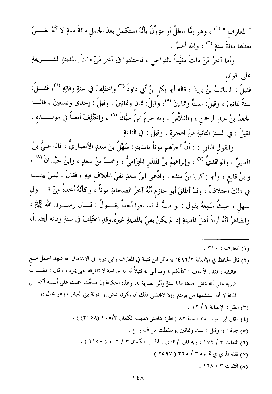 وأما آخرُ مَنْ ماتَ مقيَّداً بالنواحي، فاختلفوا في آخرِ مَنْ ماتَ بالمدينةِ الشريفةِ على أقوالٍ: