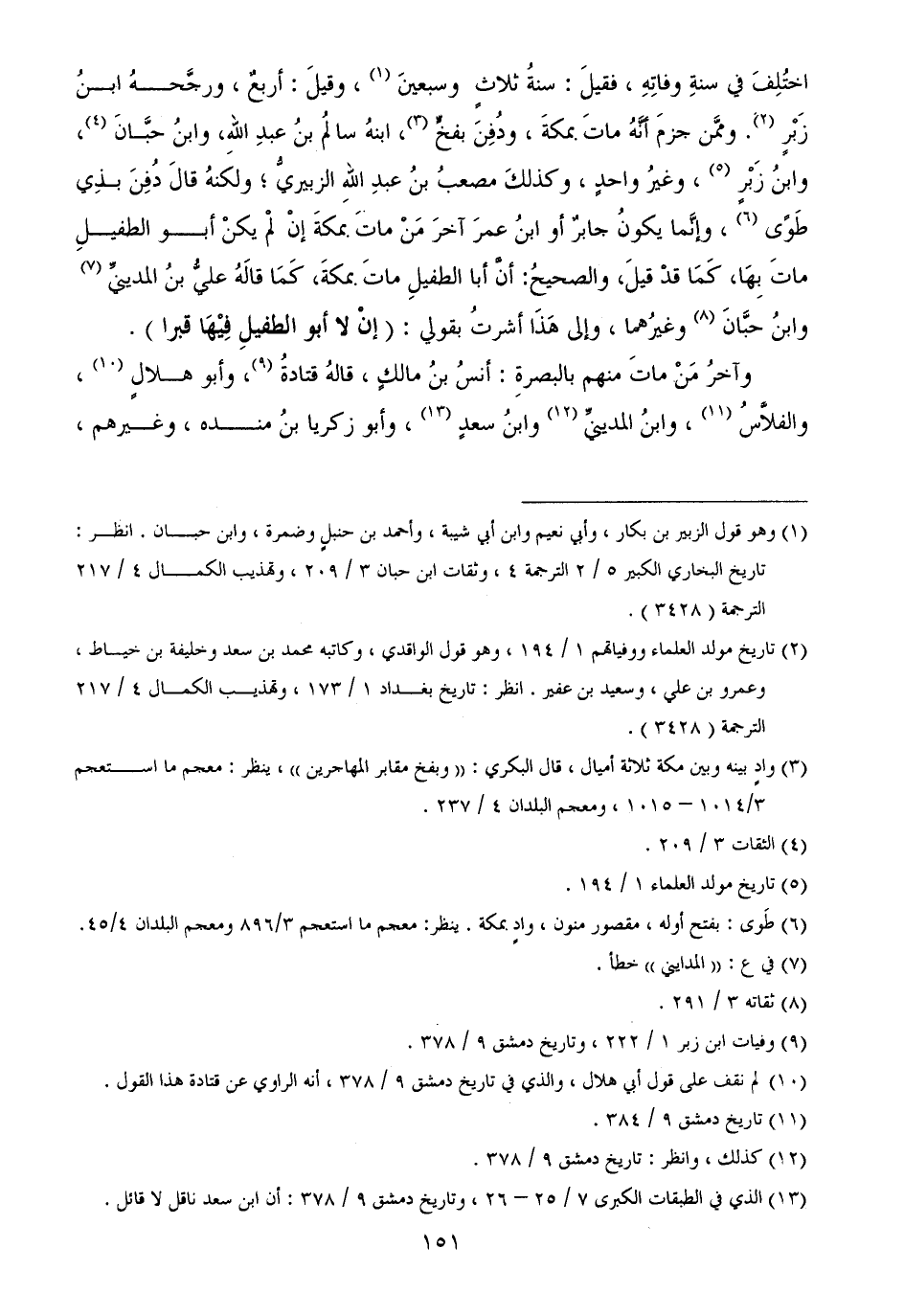 اختُلِفَ في سنةِ وفاتِهِ، فقيلَ: سنةُ ثلاثٍ وسبعينَ، وقيلَ: أربعٌ، ورجَّحهُ ابنُ زَبْرٍ. وممَّن جزمَ أنَّهُ ماتَ بمكةَ، ودُفِنَ بفخٍّ، ابنهُ سالمُ بنُ عبدِ اللهِ، وابنُ حبَّانَ، وابنُ زَبْرٍ، وغيرُ واحدٍ، وكذلكَ مصعبُ بنُ عبدِ اللهِ الزبيريُّ؛ ولكنهُ قالَ دُفِنَ بذِي طَوًى، وإنَّما يكونُ جابرٌ أو ابنُ عمرَ آخرَ مَنْ ماتَ بمكةَ إنْ لمْ يكنْ أبو الطفيلِ ماتَ بِهَا، كَمَا قدْ قيلَ، والصحيحُ: أنَّ أبا الطفيلِ ماتَ بمكةَ، كَمَا قالَهُ عليُّ بنُ المدينيِّ وابنُ حبَّانَ وغيرُهما، وإلى هَذَا أشرتُ بقولي: (إنْ لا أبو الطفيلِ فِيْهَا قبرا) .