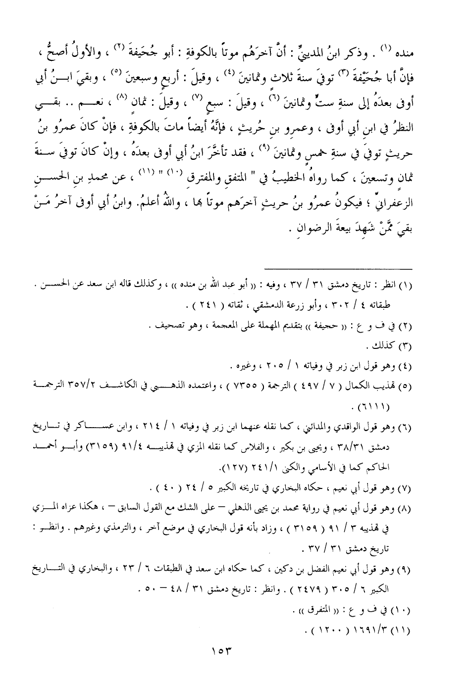 منده. وذكر ابنُ المدينيِّ: أنَّ آخرَهُم موتاً بالكوفةِ: أبو جُحَيفةَ، والأولُ أصحُّ، فإنَّ أبا جُحَيْفةَ توفيَ سنةَ ثلاثٍ وثمانينَ، وقيلَ: أربعٍ وسبعينَ، وبقيَ ابنُ أبي أوفى بعدَهُ إلى سنةِ ستٍّ وثمانينَ، وقيلَ: سبعٍ، وقيلَ: ثمانٍ، نعم.. بقي النظرُ في ابنِ أبي أوفى، وعمرِو بنِ حُريثٍ، فإنَّهُ أيضاً ماتَ بالكوفةِ، فإنْ كانَ عمرُو بنُ حريثٍ توفيَ في سنةِ خمسٍ وثمانينَ، فقد تأخَّرَ ابنُ أبي أوفى بعدَهُ، وإنْ كانَ توفيَ سنةَ ثمانٍ وتسعينَ، كما رواهُ الخطيبُ في " المتفقِ والمفترقِ "، عن محمدِ بنِ الحسنِ الزعفرانيِّ؛ فيكونُ عمرُو بنُ حريثٍ آخرَهم موتاً بها، واللهُ أعلمُ. وابنُ أبي أوفى آخرُ مَنْ بقيَ ممَّنْ شَهِدَ بيعةَ الرضوانِ.