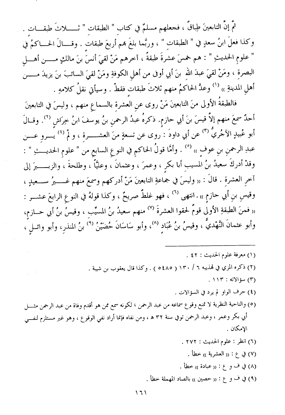 " علومِ الحديثِ ": هم خمسَ عشرةَ طبقةً، آخرهم مَنْ لقيَ أنسَ بنَ مالكٍ من أهلِ البصرةِ، ومَنْ لقيَ عبدَ اللهِ ابنَ أبي أوفى من أهلِ الكوفةِ ومَنْ لقيَ السائبَ بنَ يزيدَ من أهلِ المدينةِ)) وعدَّ الحاكمُ منهم ثلاثَ طبقاتٍ فقطْ. وسيأتي نقلُ كلامهِ.