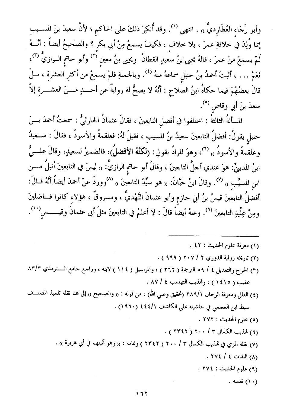 المسألةُ الثالثةُ: اختلفوا في أفضلِ التابعينَ، فقالَ عثمانُ الحارثيُّ: سمعتُ أحمدَ بنَ حنبلٍ يقولُ: أفضلُ التابعينَ سعيدُ بنُ المسيبِ، فقيلَ لهُ: فعلقمةُ والأسودُ، فقالَ: سعيدُ وعلقمةُ والأسودُ)) ، وهوَ المرادُ بقولي: (لكنَّهُ الأفضلُ) ، فالضميرُ لسعيدٍ، وقالَ عليُّ ابنُ المدينيِّ: هوَ عندي أجلُّ التابعينَ، وقالَ أبو حاتمٍ الرازيُّ: ((ليسَ في التابعينَ أنبلُ من ابنِ المسيِّبِ)) . وقالَ ابنُ حبَّانَ: ((هو سيِّدُ التابعينَ)) ووردَ عنْ أحمدَ أيضاً أنَّهُ قالَ: أفضلُ التابعينَ قيسُ بنُ أبي حازمٍ وأبو عثمانَ النَّهْديُّ، ومسروقٌ، هؤلاءِ كانوا فاضلينَ ومِنْ عِلْيةِ التابعينَ. وعنهُ أيضاً قالَ: لا أعلمُ في التابعينَ مثلَ أبي عثمانَ وقيسٍ.