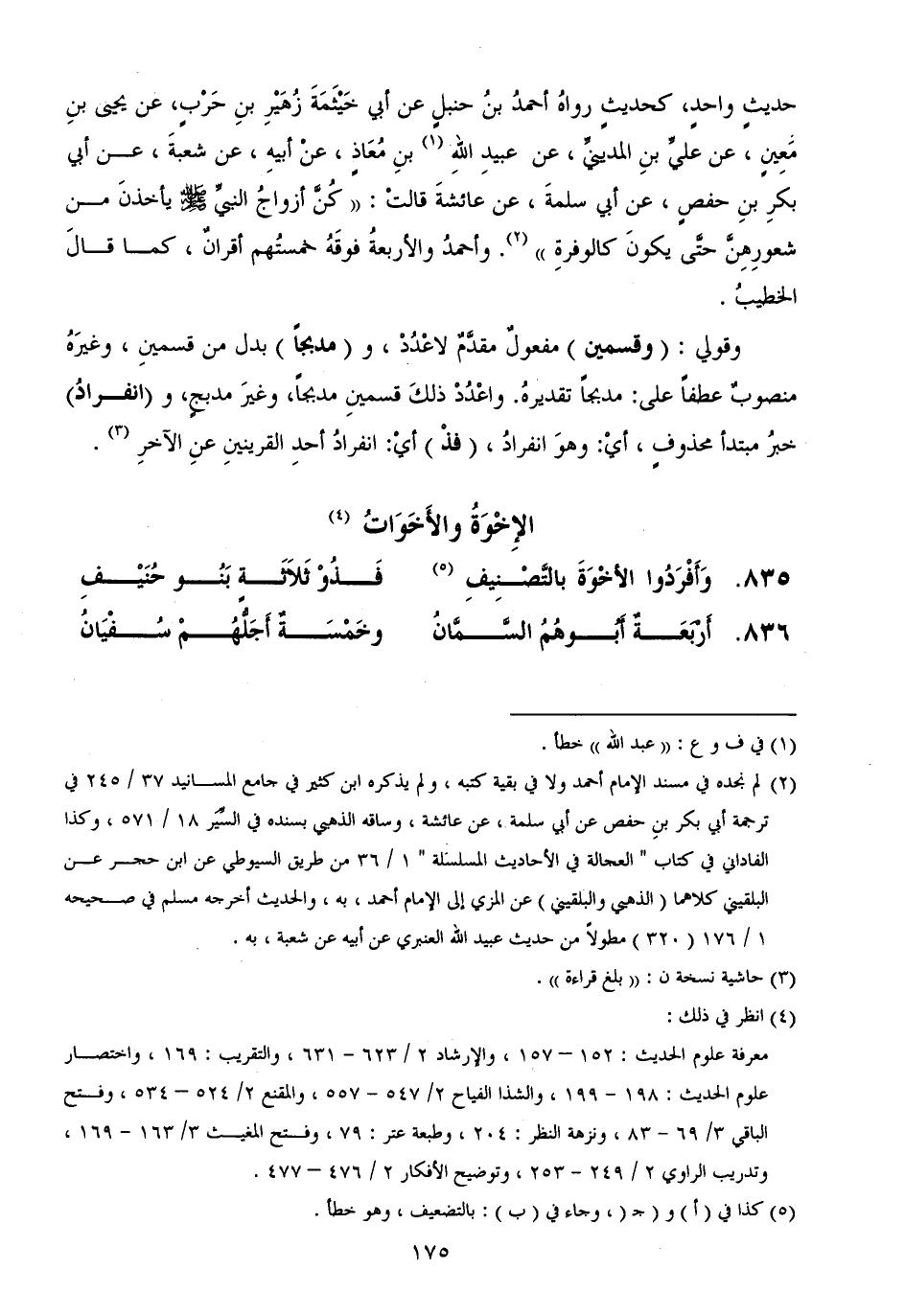 835.... وَأَفْرَدُوا الأخْوَةَ بالتَّصْنِيفِ ... فَذُوْ ثَلاَثَةٍ بَنُو حُنَيْفِ